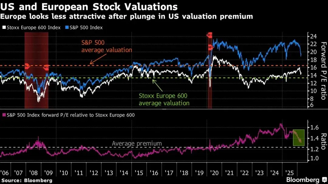 美欧股市估值对比。美股估值下降较快,对欧股溢价收窄。