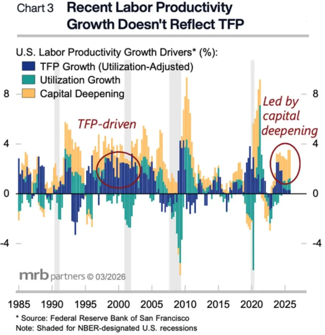 当前的生产率提升,更像是“资本投入型”的短期脉冲,而非“技术驱动型”的长期革命。如果未来资本开支放缓,生产率增长可能回落。