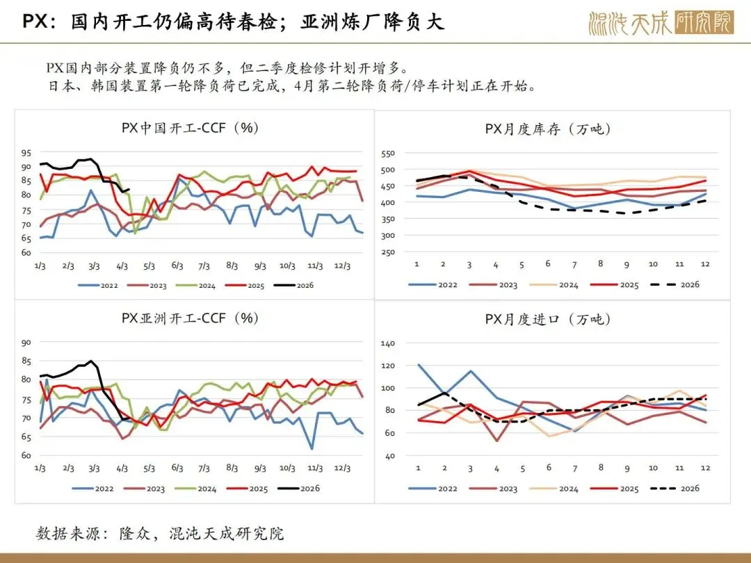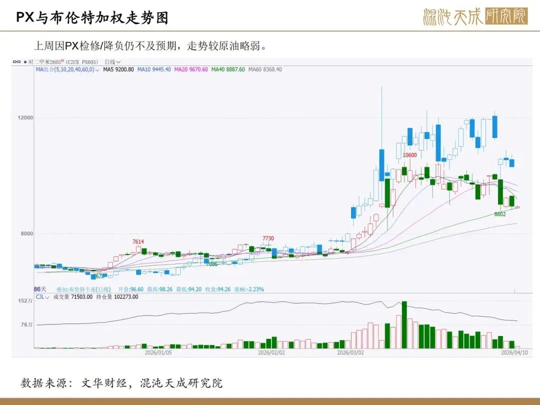 结论:美伊达成两周临时停火协议,伊朗要两周内开放海峡,能化大幅回调;是否转为趋势下跌,仍要关注海峡通行、中东装置重启、亚洲炼厂负荷提升实际情况,鉴于双方诉求仍不一致仍有反复,先以震荡看待;且因供应恢复还待时间,去库节奏暂不变,预计PX仍偏强,行情进入强现实弱预期节奏。