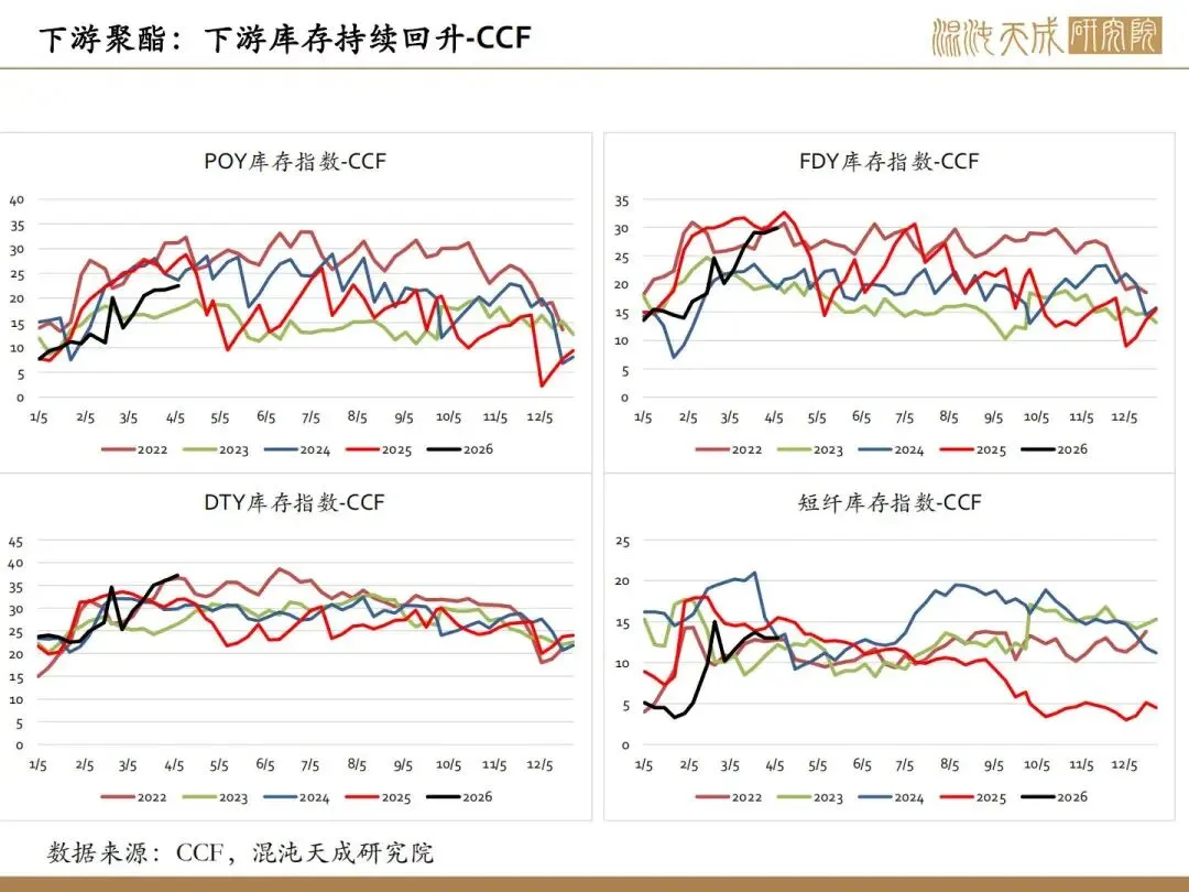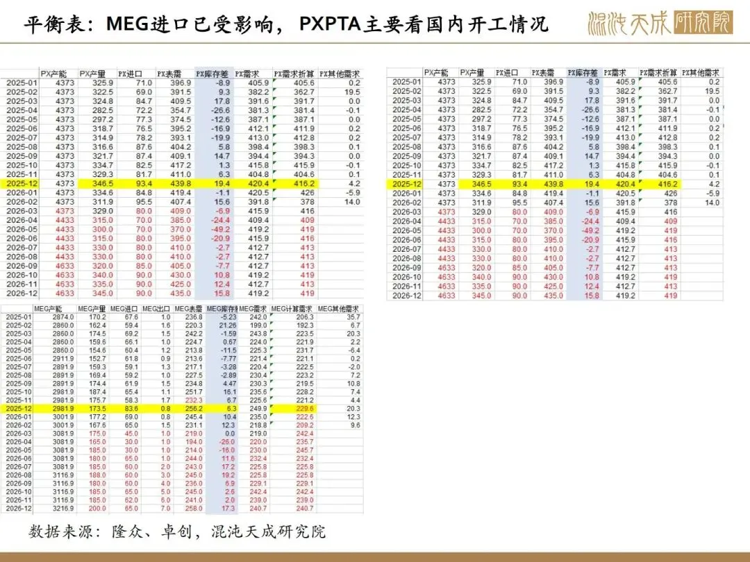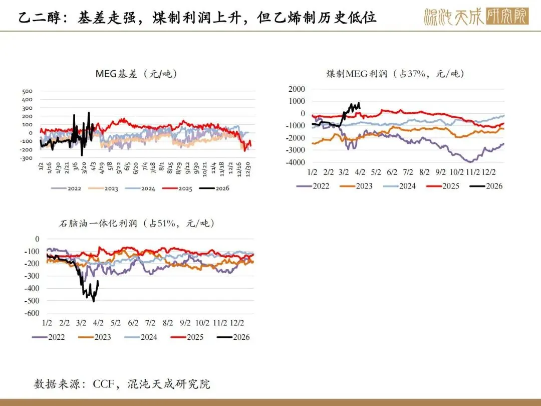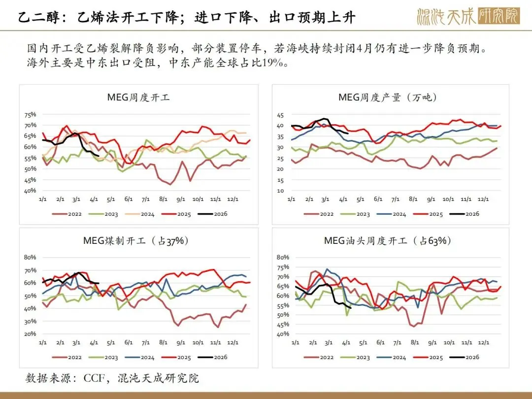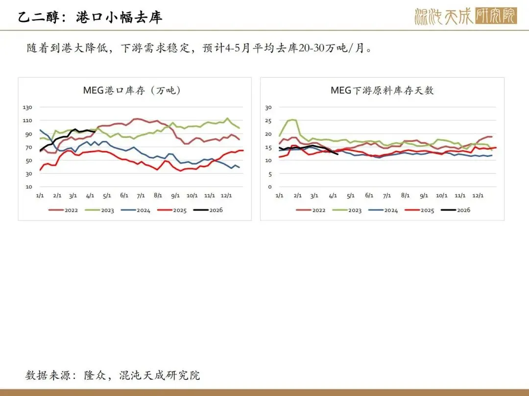 乙二醇受海峡通行、中东装置恢复节奏影响大,若确定中东恢复,乙二醇将再次进入累库,但在其恢复前,将持续去库,目前预计至5月格局不变。