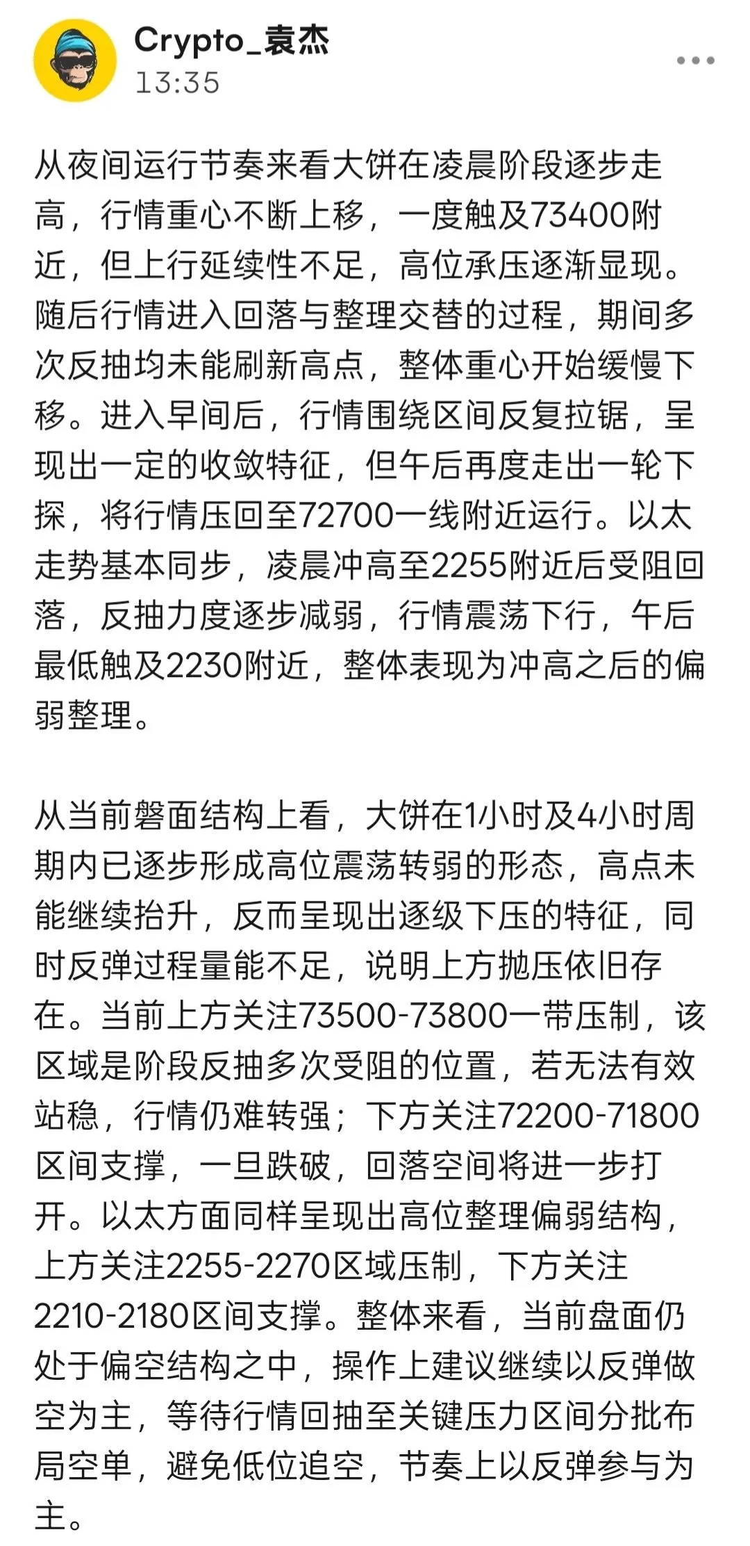 从当前磐面结构来看,大饼在中周期上已经出现比较典型的弱化信号,高点不再上移,而低点则在逐步下探,4小时级别承压特征明显,说明上方抛压仍在释放过程中。短期上方重点关注73200-73500这一带的压制区间,这是前高与密集成交区叠加的位置,多次反抽未破意味着这里仍然是空头防守的核心区域;下方则关注72200-71800支撑带,一旦行情再次回落并有效跌破,结构上容易形成二次下探甚至扩大回落空间。以太同样处于偏弱整理结构中,上方2250-2280区间压制持续有效,下方支撑关注2215-2190一带,一旦失守同样会打开下行空间。综合来看,当前并不具备持续上攻的条件,而更像是高位震荡后的逐步走弱过程,因此后续操作思路保持以反弹做空参与实磐,也要尽量避免在中间震荡区追单,顺着结构去捕捉回落延续的空间。