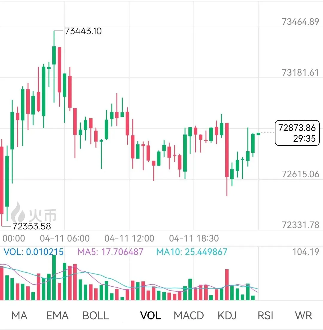 日内整体的走势更偏向于在高位区间内反复消耗动能的运行节奏,大饼在早间阶段一度冲高至73400附近,但上行动能并未持续,随即进入震荡回落,行情围绕72800一线展开多轮拉锯,磐中虽有几次向上试探,但始终无法突破前高压制,反而在午后逐步转为震荡下压,晚间更是出现一波快速下探至72500附近的动作,随后才有所修复,但整体反弹力度有限,行情重心较早间已有明显下移。以太走势基本同步,早间触及2255一线后同样进入震荡走弱节奏,磐中多次反抽均未形成延续,晚间插针下探至2230下方后快速收回,但上方空间依旧受限,全天表现为高位区间内反复拉扯,结构上开始由强转弱,磐中分歧逐步加大。