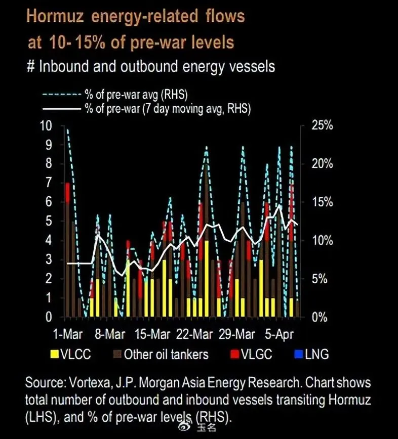 先别着急给答案,我们做一个梳理,先从停火角度,我们注意到如今是美很难拿下伊朗;而伊朗不能获得“补偿”,也没有快速结束的意思,但双方又都有点“打不动”了,毕竟大炮一响黄金万两,消耗也是很大的。因此,这一次霍尔木兹海峡不仅没有开放,甚至通过率更低了,这是非常值得注意的。因为停火因素直接在4.8日反弹时全部兑现了,一旦未来消息面有反复,势必带来调整的走势,这种调整并不单纯说是指数,而是热点类型变化。