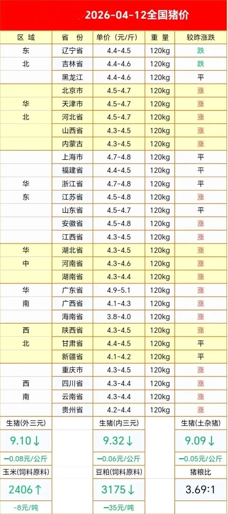 2026年4月12日全国生猪行情汇总:全国外三元均价4.5元/斤(9.0 元 /kg),标猪逢高(4.6+)分批出栏,不压栏!