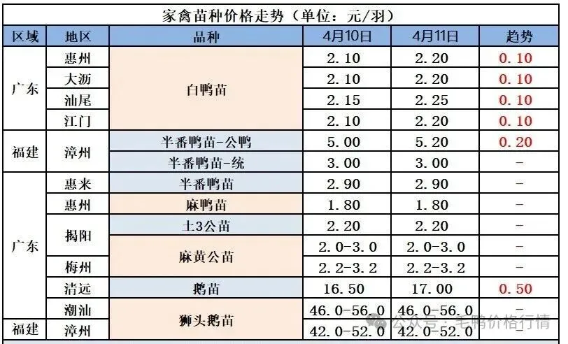 2026年4月12日鸭苗价格行情:(单位:元/羽)