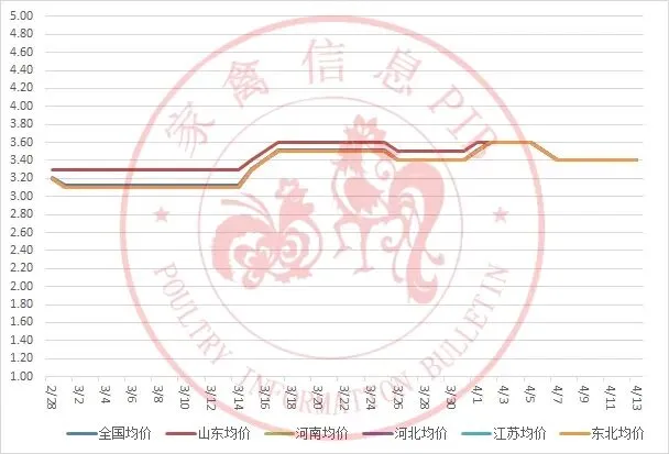 2026年2月28日-2026年4月13日主流地区白羽鸡鸡苗均价走势图