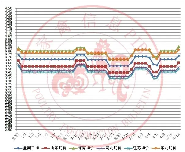2026年2月27日-2026年4月12日主流地区白羽鸡毛鸡均价走势图