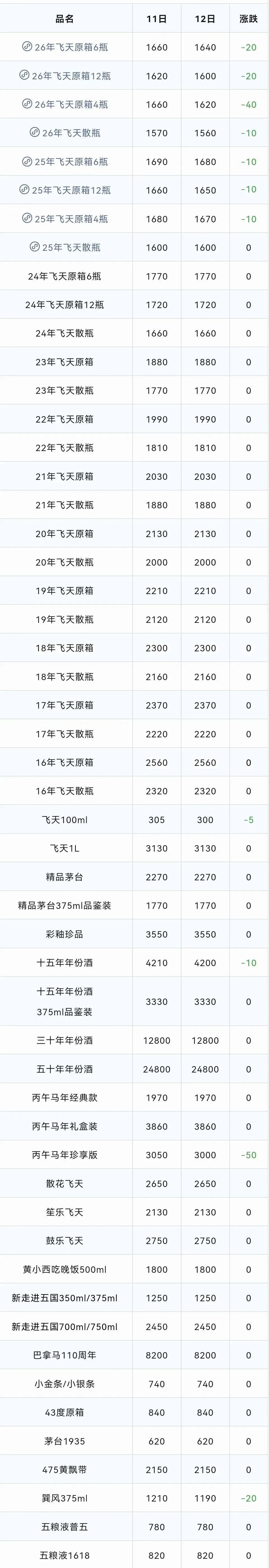 常规茅台中:2026年飞天原箱6瓶装、2026年飞天原箱12瓶装、2026年飞天原箱4瓶装、2026年飞天散瓶、2025年飞天原箱6瓶装、2025年飞天原箱12瓶装、2025年飞天原箱4瓶装、100ml飞天、十五年年份酒、巽风375ml飞天下跌;