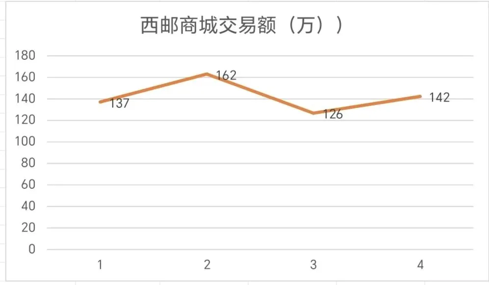 西邮商城本周交易额合计567万,上周662万, 下降95万,日均成交额113.4万。