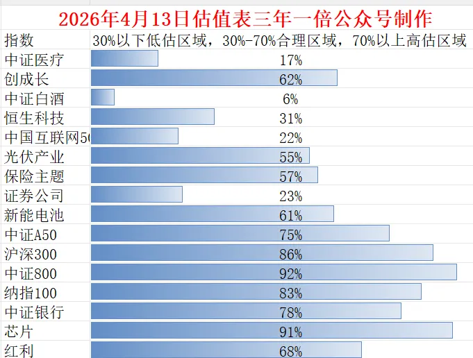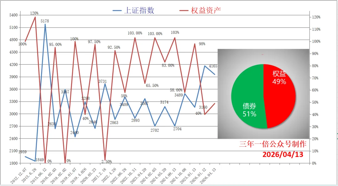 很久没有更新估值表了,今天周末加班更新一下,2026年4月13日收盘后资产配置模型显示权益仓位49%,债券51%。