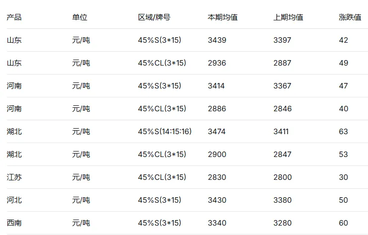 预计价格就在当前区间窄幅波动,大涨没动力,大跌有成本撑着。预计45%硫基3350-3650元/吨,氯基2800-3000元/吨。