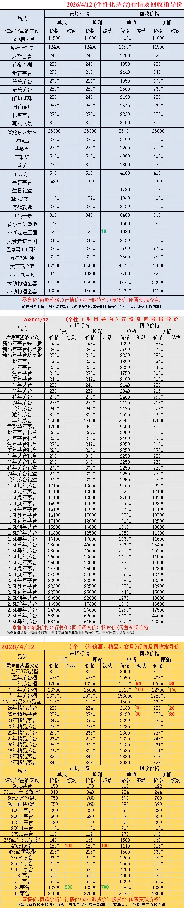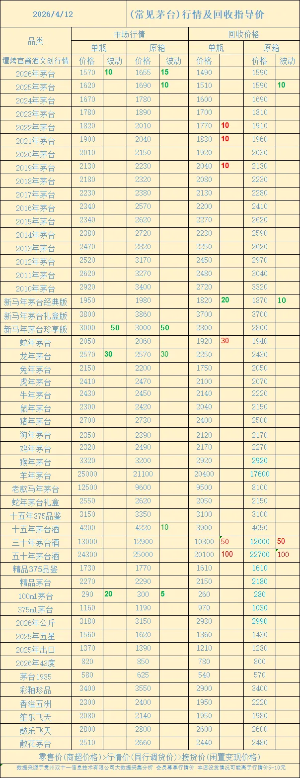 今天是2026年4月12日星期日,与昨日行情相比:常规茅台中:2026年飞天原箱6瓶装、2026年飞天散瓶、2025年飞天原箱6瓶装、、100ml飞天、十五年年份酒;生肖茅台中:丙午马年珍享版、龙年生肖原箱下跌;文创个性化茅台中:新走进五国(小)下跌;特殊容量飞天中:400ml飞天上涨;3L飞天下跌,回收参考价常规茅台中:2019年散瓶飞天、2021年散瓶飞天、2022年散瓶飞天涨价,2025年茅台原箱跌价,生肖茅台中:蛇年茅台散瓶涨价,丙午马年经典版原箱和散瓶跌价,年份茅台中:30年茅台原箱和散瓶、50年茅台原箱和散瓶涨价,精品茅台中:2025年原箱和散瓶、2026年原箱和散瓶涨价。