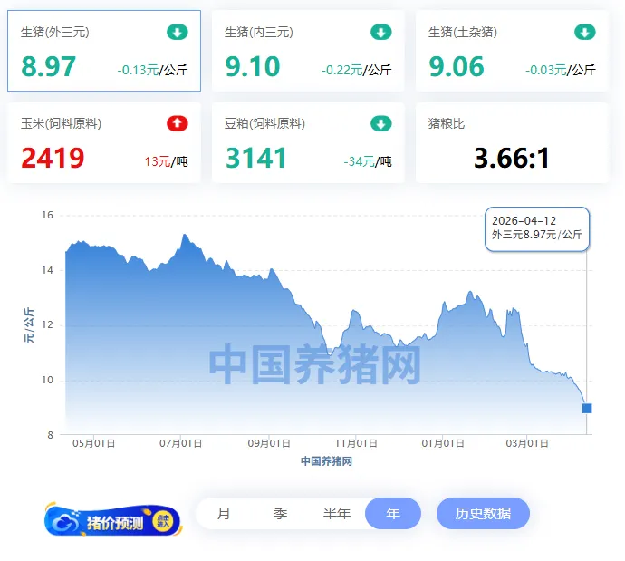 2026年4月12日全国外三元均价8.97元/公斤,今日猪价较昨日报价下跌了0.13元/公斤。