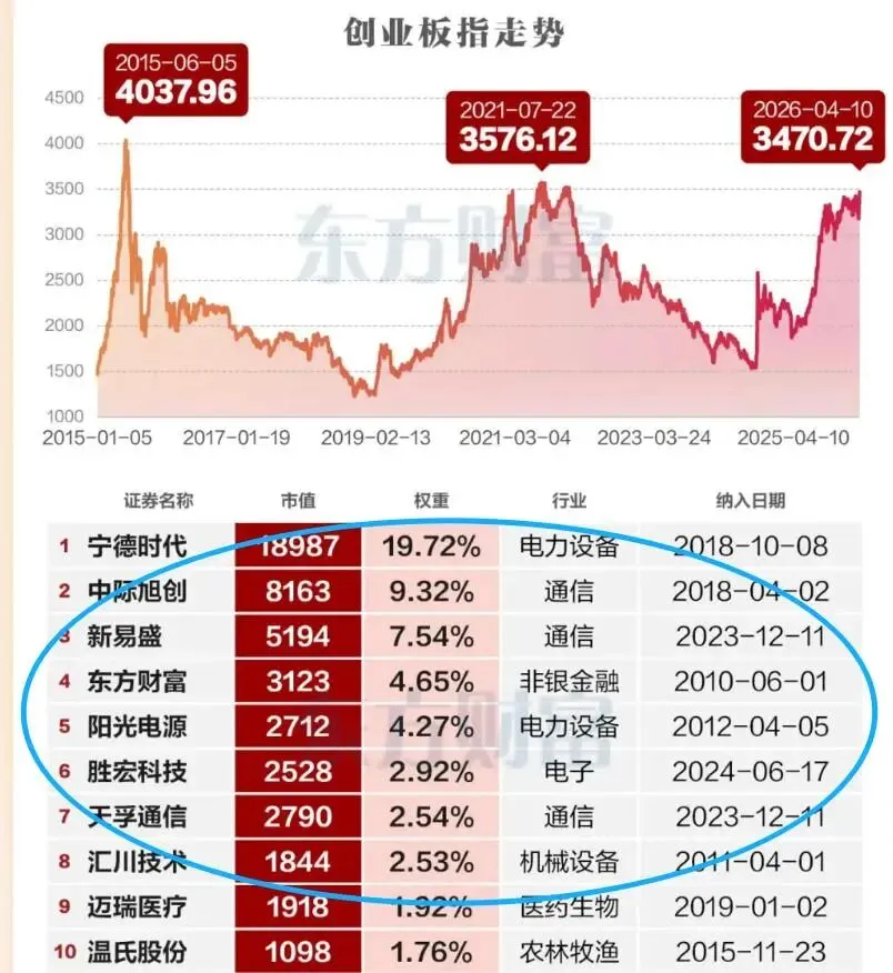 本轮创业板上涨的另一个特征是机构资金高度集中在头部权重标的,而非增量资金入场推动的全面行情。数据显示,宁德时代的融资余额超过200亿元,中际旭创、东方财富等也均处于融资盘前列。公募基金一季报显示,新能源、光模块、AI算力等赛道龙头已成为众多基金的核心持仓。