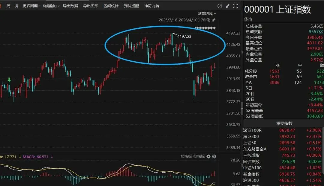 更值得警惕的是,并非只有创业板指出现这一信号,沪深两市今日也同步呈现类似背离。多指数、多周期的背离共振,大幅提升了阶段震荡或调整的概率。
