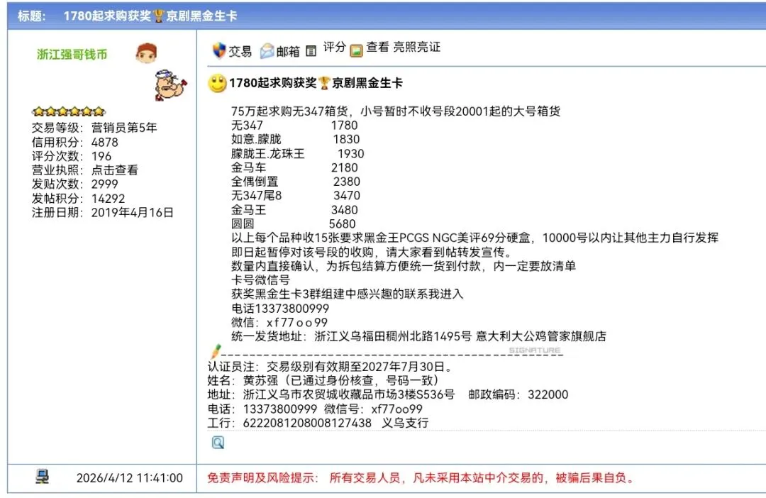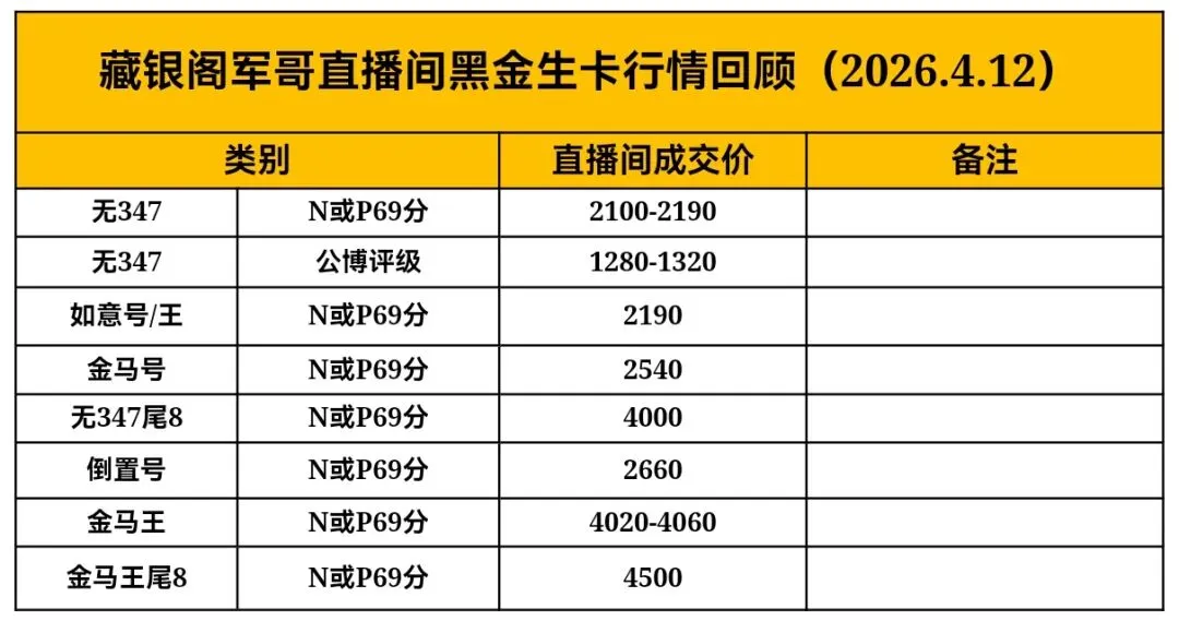 >2026年4月12日获奖纪念黑金生卡行情播报