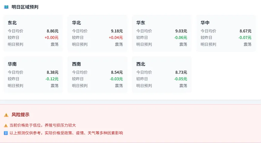 🔗 产销价差分析:猪肉(16.82) - 生猪(8.81) = 8.01元(价差率90.9%)。价差率较高,屠宰利润丰厚,但终端消费承压,需警惕价格回调风险。