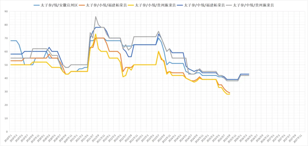 当地新货上市量不大,近期有商前来寻货,带动价格出现上扬,现一般货售价47元左右,饮片货售价50-51元,大货不好组织,交易以小批量购买为主。