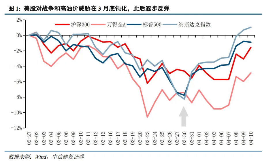 虽然战争对市场的影响逐步钝化,但考虑到当前美股美债都未对长期高油价进行充分定价,如果中东原油生产运输持续受阻,全球通胀高企,金融市场可能仍会遭受滞胀打击。因此,全球市场短期共振修复后,中期仍应密切关注谈判进展和油价变化。