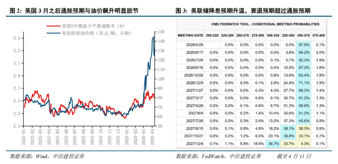 因此,我们发现自3月底以来,市场对战争的反映开始逐步钝化,美股、美债都没有充分反映长期高油价的威胁,相反美国市场投资者对衰退的担忧甚于通胀,美联储未来降息预期本周再度上升。这也意味着,即使本周未能实现停火,市场在短暂下跌后也将逐步获得修复。