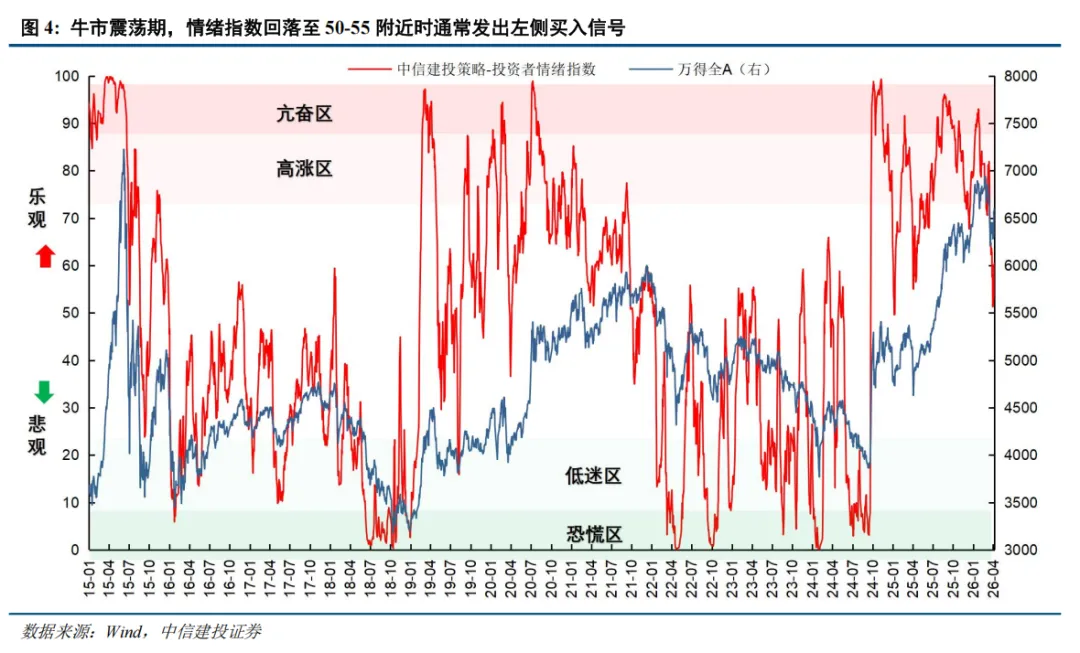 A股市场情绪也在大幅降温后明显回升。从历史上看,牛市震荡期我们构建的投资者情绪指数回落至50-55附近时通常发出左侧买入信号,市场迎来反弹行情。前期市场指数和成交明显回落,上周五情绪指数就已大幅下滑并接近50,较多资金观望等待抄底时机,反弹已在蓄势。本周停火新闻传出后市场强力反弹,也体现了A股市场情绪滑落后的修复需求。