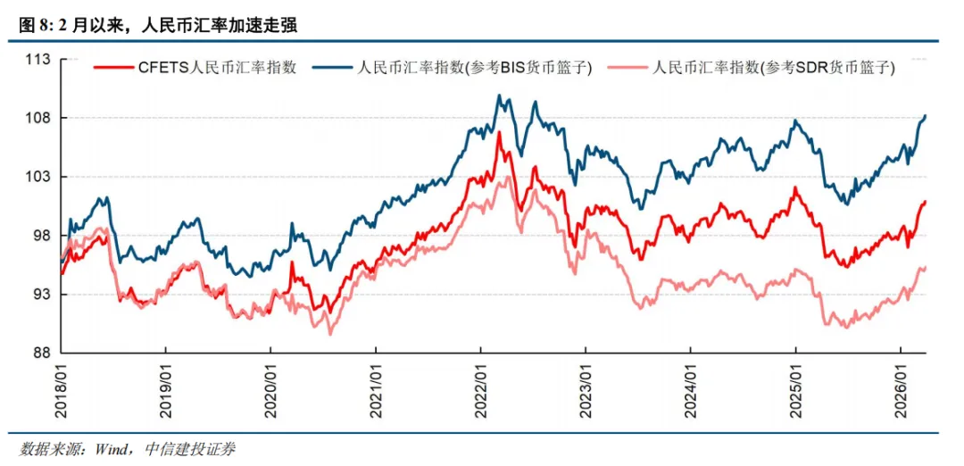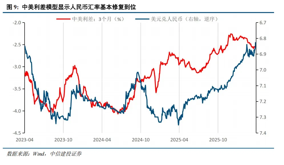 对市场流动性和风险偏好提供支撑的另一因素来自人民币汇率近期的强势表现。美以伊战争为中国带来新的战略机遇,凭借“煤炭+新能源”双支柱能源底座和稳定的供应链优势,人民币始终维持强势,中东停火后美元快速走弱进一步推升了人民币汇率走强,也对A股的反弹提供了支撑。不过根据中美3个月利差模型,目前人民币汇率已经基本修复到位,未来对A股的支撑可能有所弱化。