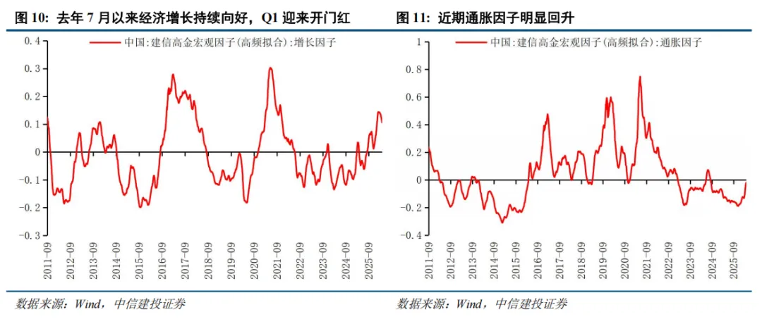 在上周的策略周思考中,我们指出“随着3月经济数据即将公布和财报季来临,市场关注点将逐步转向经济复苏成色和企业盈利改善的实质性验证”。经济的回暖和一季报业绩正是近期市场再度走强的第三个关键因素。从建信高金跟踪的增长因子和通胀因子来看:去年7月以来经济增长持续向好,Q1迎来开门红;而通胀因子近期也明显回升,即将转正。这意味着困扰中国经济多年的“通缩螺旋”问题正在得到化解。