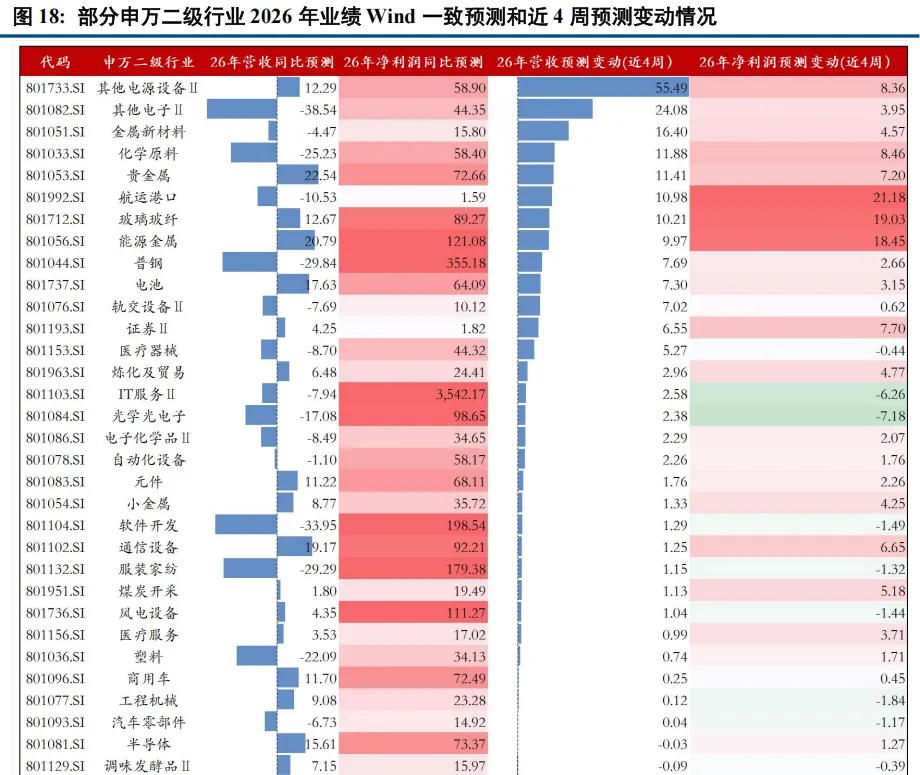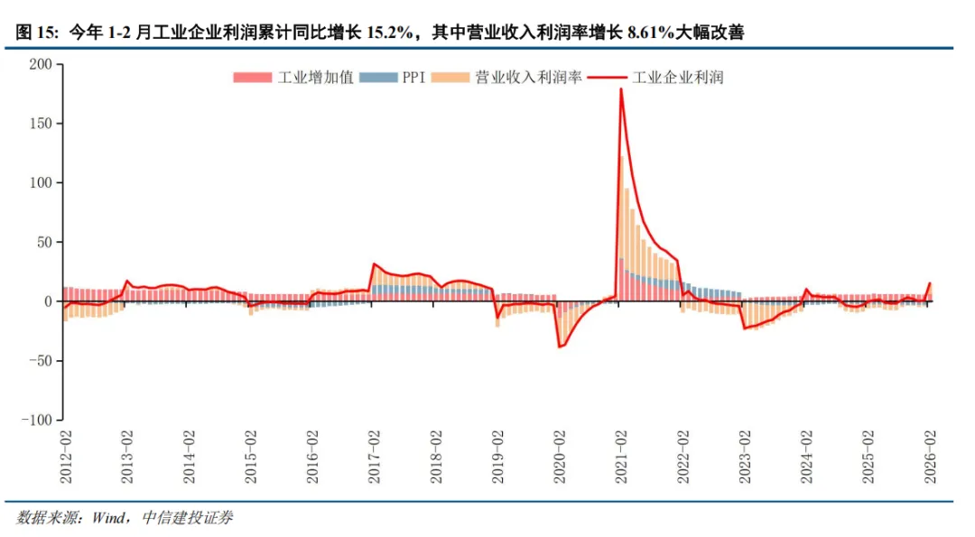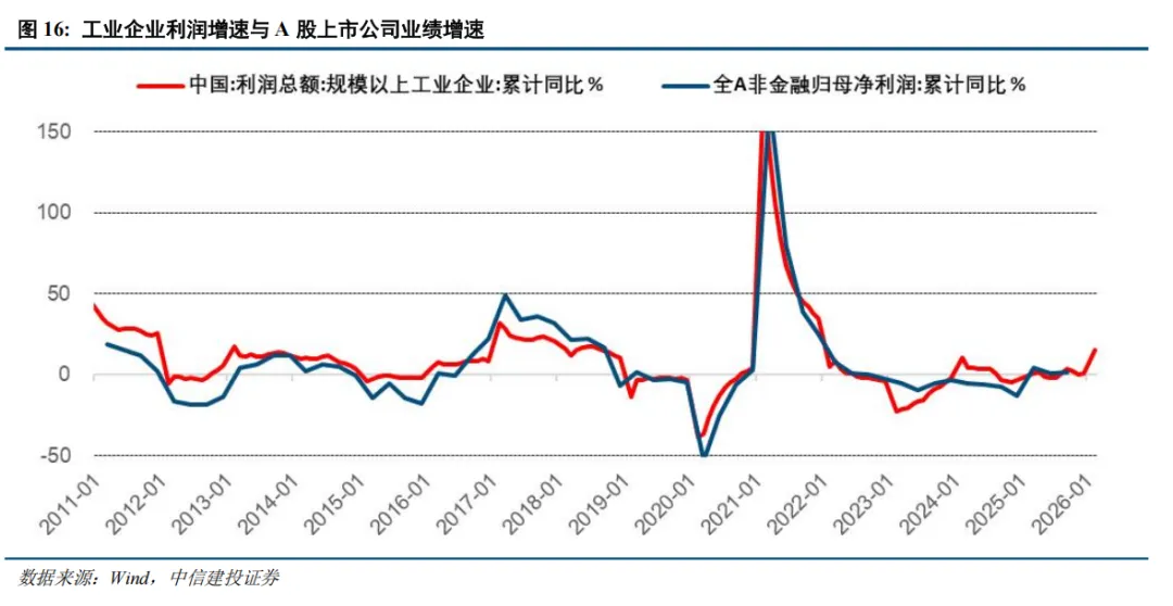 PPI同比回升通常也是工业企业盈利周期的上行期,去年全年工业企业利润实现了0.6%的小幅正增长,今年1-2月工业企业利润累计同比增长飙升至15.2%,为2022年以来最高水平,其中营业收入利润率增长8.61%大幅改善。考虑到全A非金融业绩与工业企业利润增速高度相关,预计2026年A股上市公司盈利有望迎来改善。