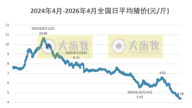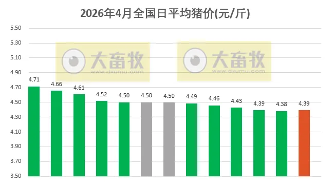 大畜牧小编根据我国27省的猪价数据,计算出2026年4月13日全国平均猪价为每斤4.39元,比昨天上涨0.01元,涨幅为0.29%,止跌小幅上涨,结束连续5天的持续下跌,也是4月以来首次出现上涨;