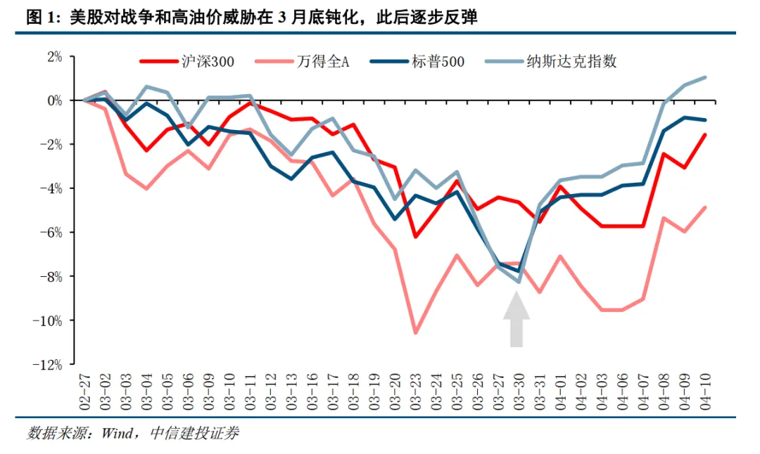 虽然战争对市场的影响逐步钝化,但考虑到当前美股美债都未对长期高油价进行充分定价,如果中东原油生产运输持续受阻,全球通胀高企,金融市场可能仍会遭受滞胀打击。因此,全球市场短期共振修复后,中期仍应密切关注谈判进展和油价变化。