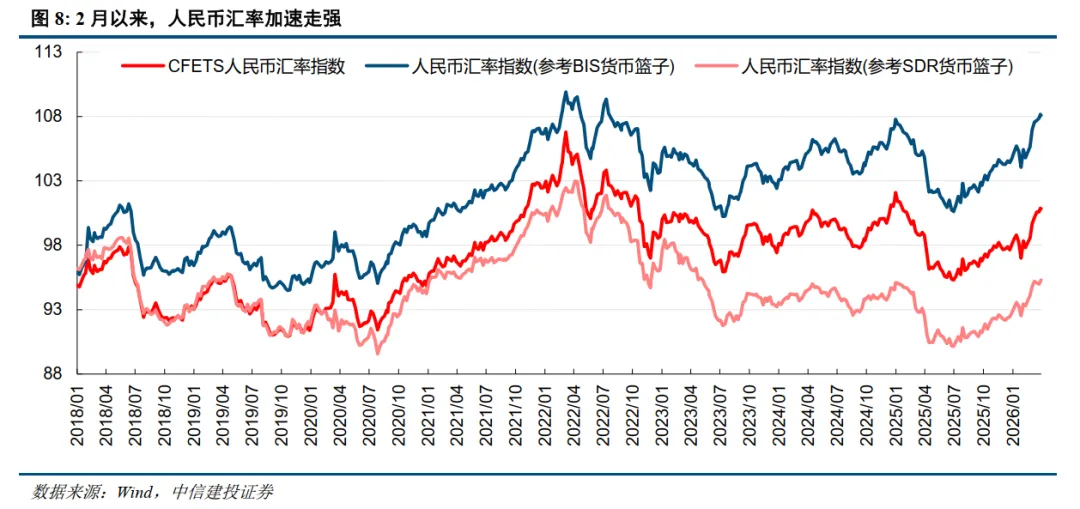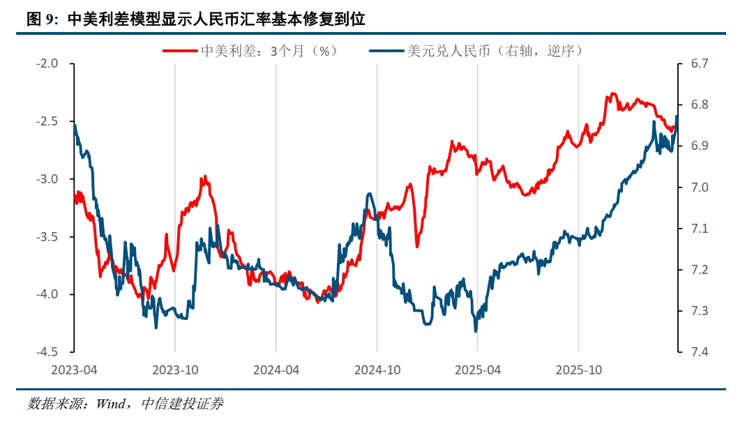 对市场流动性和风险偏好提供支撑的另一因素来自人民币汇率近期的强势表现。美以伊战争为中国带来新的战略机遇,凭借“煤炭+新能源”双支柱能源底座和稳定的供应链优势,人民币始终维持强势,中东停火后美元快速走弱进一步推升了人民币汇率走强,也对A股的反弹提供了支撑。不过根据中美3个月利差模型,目前人民币汇率已经基本修复到位,未来对A股的支撑可能有所弱化。