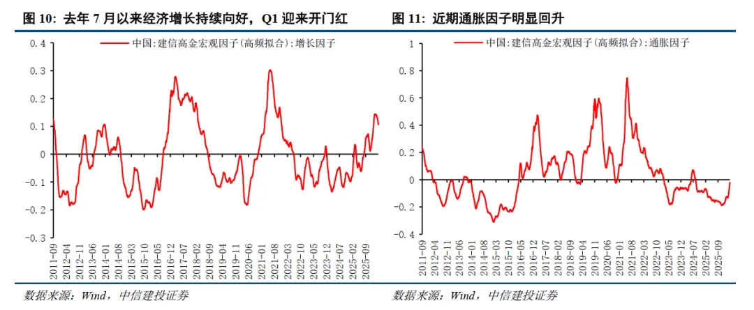 在上周的策略周思考中,我们指出“随着3月经济数据即将公布和财报季来临,市场关注点将逐步转向经济复苏成色和企业盈利改善的实质性验证”。经济的回暖和一季报业绩正是近期市场再度走强的第三个关键因素。从建信高金跟踪的增长因子和通胀因子来看:去年7月以来经济增长持续向好,Q1迎来开门红;而通胀因子近期也明显回升,即将转正。这意味着困扰中国经济多年的“通缩螺旋”问题正在得到化解。