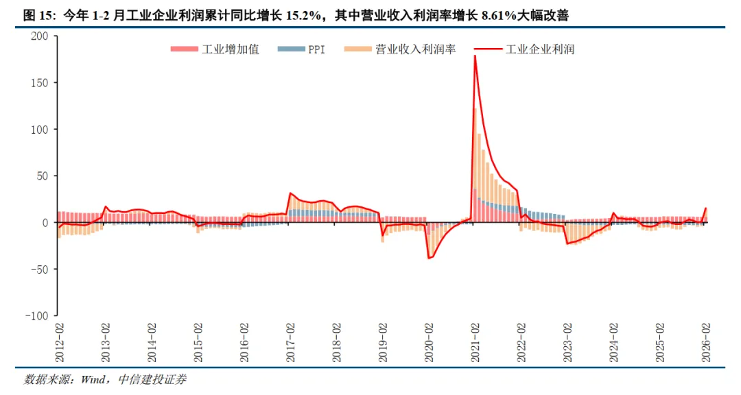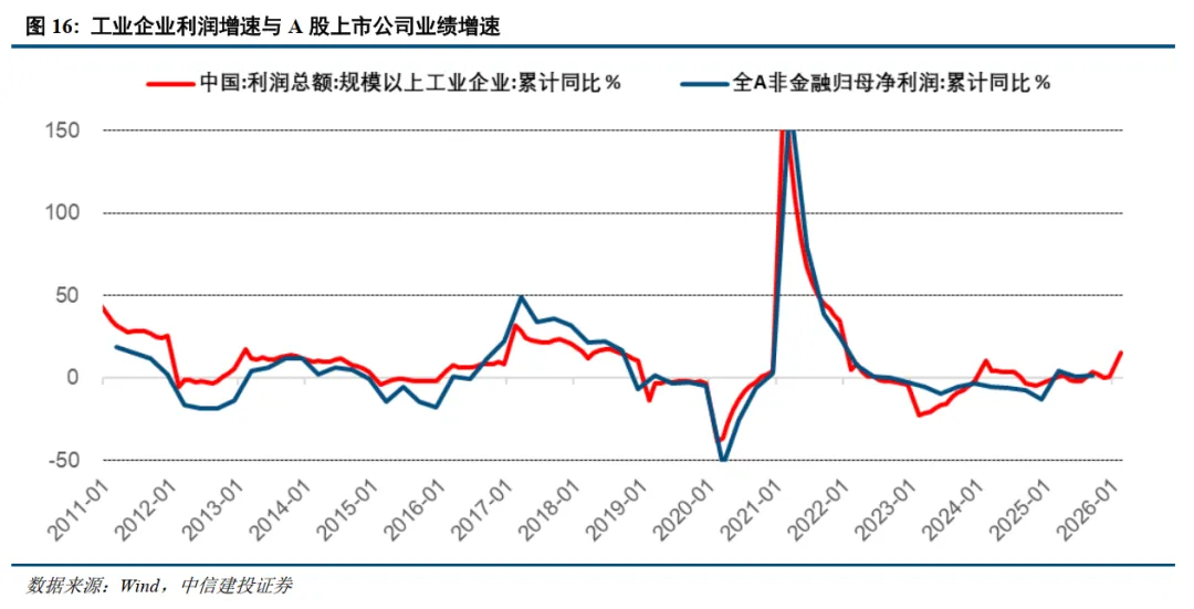 PPI同比回升通常也是工业企业盈利周期的上行期,去年全年工业企业利润实现了0.6%的小幅正增长,今年1-2月工业企业利润累计同比增长飙升至15.2%,为2022年以来最高水平,其中营业收入利润率增长8.61%大幅改善。考虑到全A非金融业绩与工业企业利润增速高度相关,预计2026年A股上市公司盈利有望迎来改善。