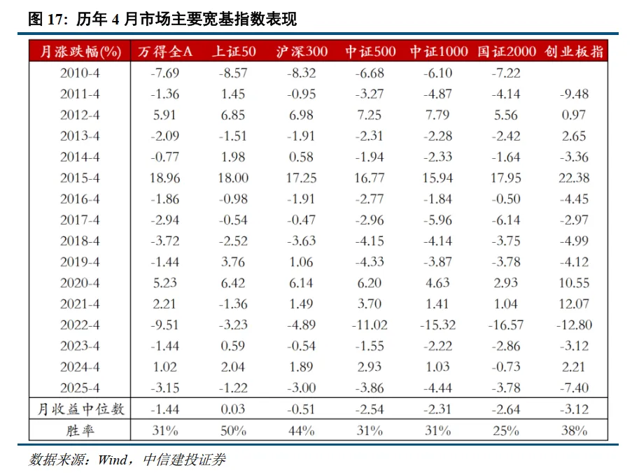 从季节效应来看,4月市场往往季节性走弱,这主要是由于随着两会政策预期落地、开工季经济数据披露和年报一季报披露,市场从流动性和风险偏好较好的“春季行情”过渡到注重基本面和业绩兑现的“财报季”。由于近年企业盈利经常偏弱(参见前文图16),因此4月市场主要宽基指数胜率大多低于50%,代表大盘价值风格的上证50胜率最高,代表小盘股风格的国证2000表现最弱。