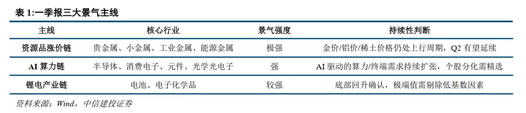 1) 一季报高景气三大主线:资源品涨价链(黄金、能源金属、铝、小金属)、AI算力链(光通信、玻璃纤维、燃气轮机)、锂电产业链(电池、锂电材料)等。