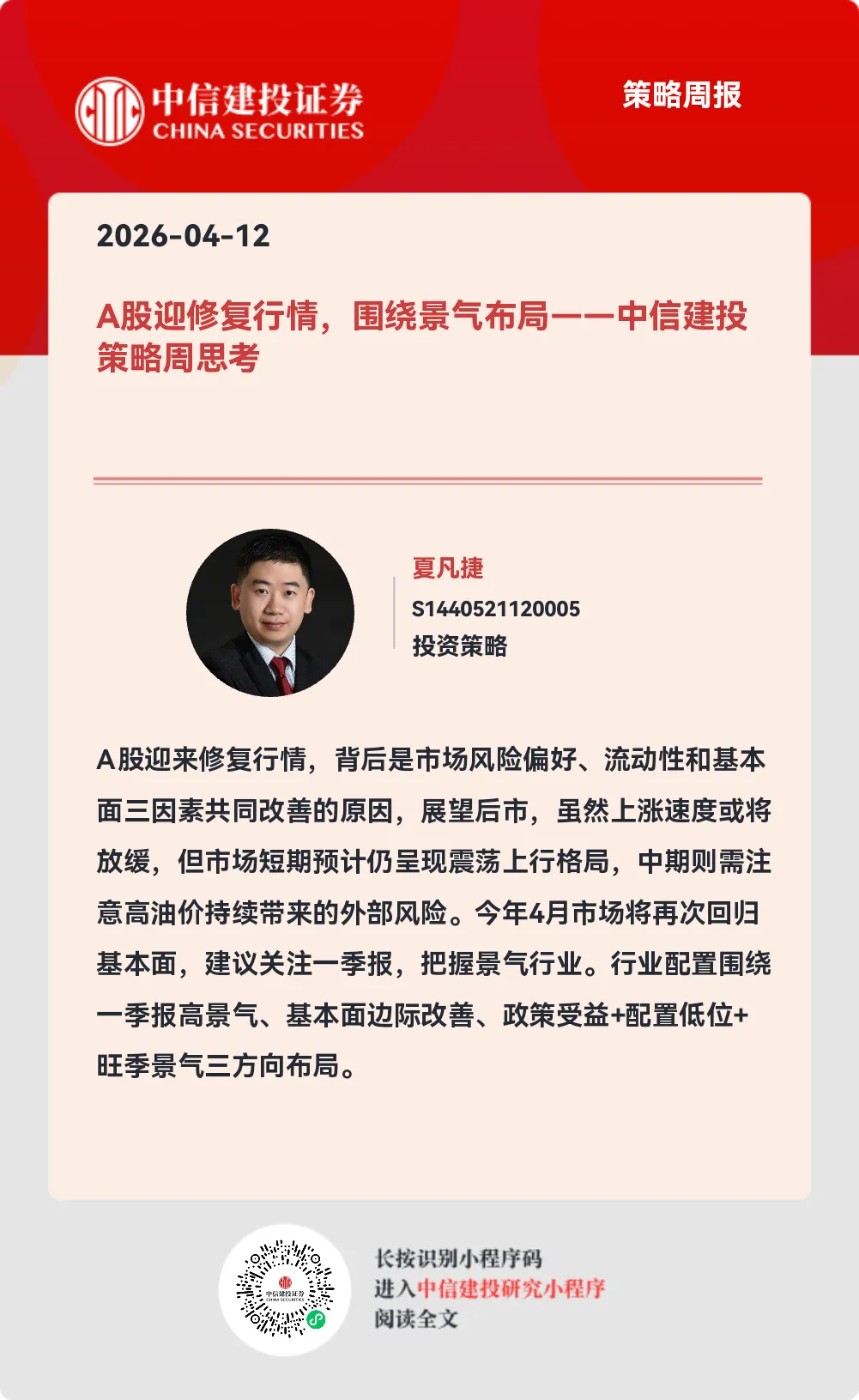 总的来说,本周A股迎来修复行情,其背后是市场风险偏好、流动性和基本面三因素共同改善的原因,其中影响风险偏好和流动性的中东局势缓和与人民币升值两大利好后续或有所弱化,我们继续强调关注重点转向基本面因素,尤其是通胀回升和公司业绩的验证与预期变化。展望后市,虽然上涨速度或将放缓,但市场短期预计仍呈现震荡上行格局,中期则需注意高油价持续带来的外部风险。