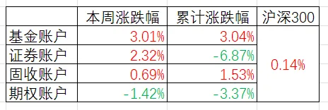 固收账户周涨0.69%,年度累计涨幅1.3%。受益于权益类持仓大幅反弹,本周固收类基金也强劲修复。