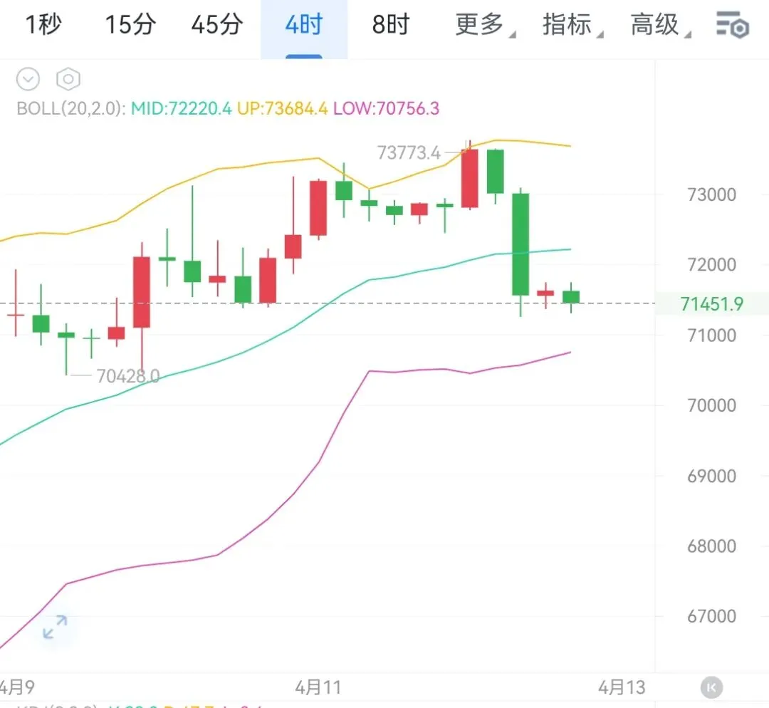 日线图上,今日开盘即延续昨日冲高回落的弱势格局,一根实体中阴向下反包,虽然距离日线中轨尚有空间,但这恰恰说明回调还未到位。此前反复强调的70000大关看似是支撑,但在弱势阴跌面前,这个位置大概率要被测试甚至刺破。趋势一旦转弱,所谓的“回落代替回踩”就会演变为深度调整,支撑不再是铁底,而是用来破的。