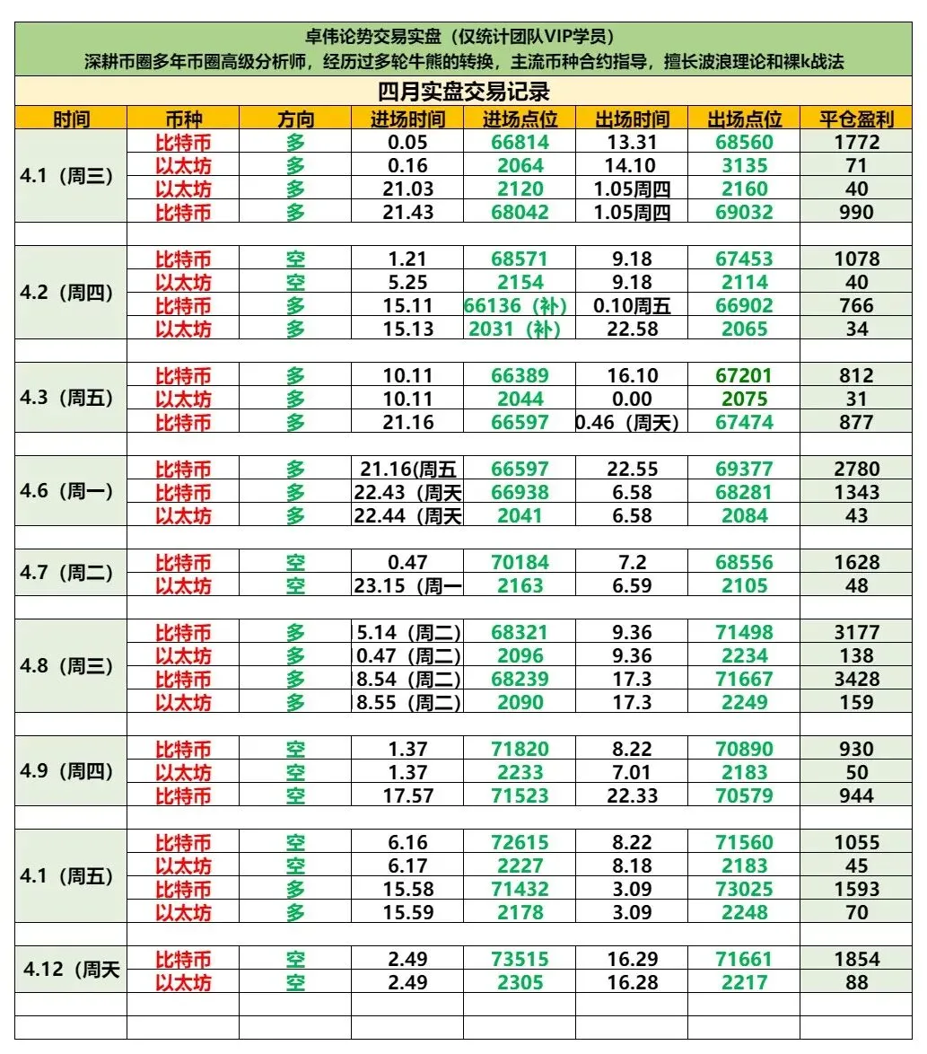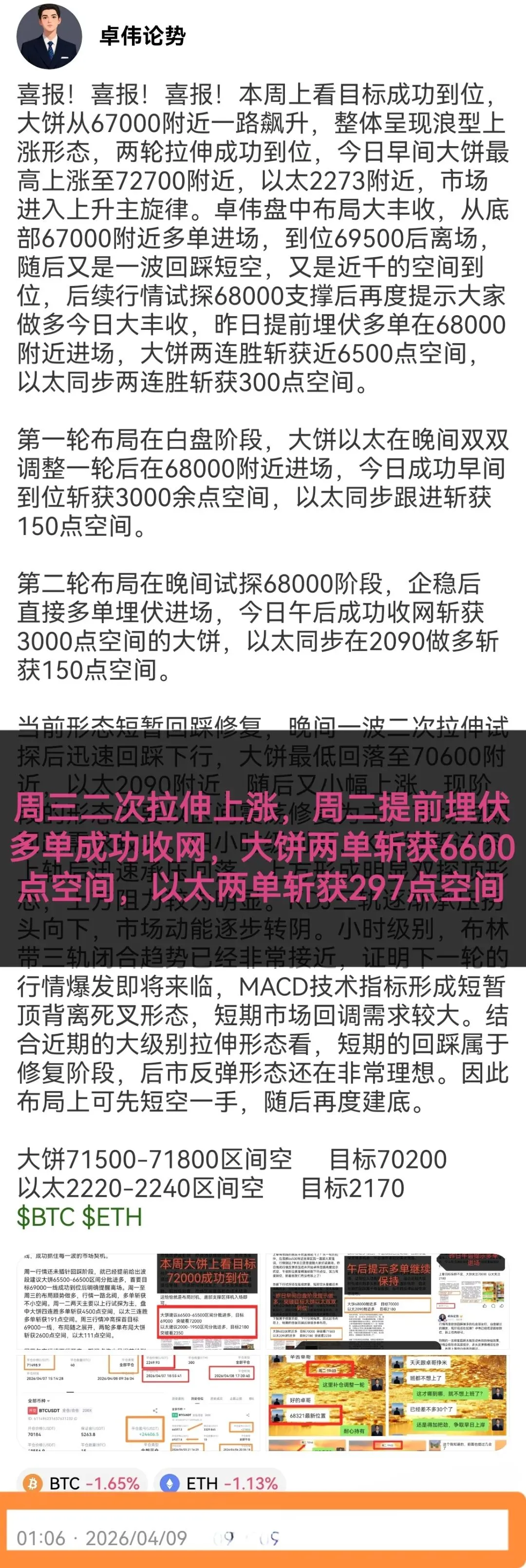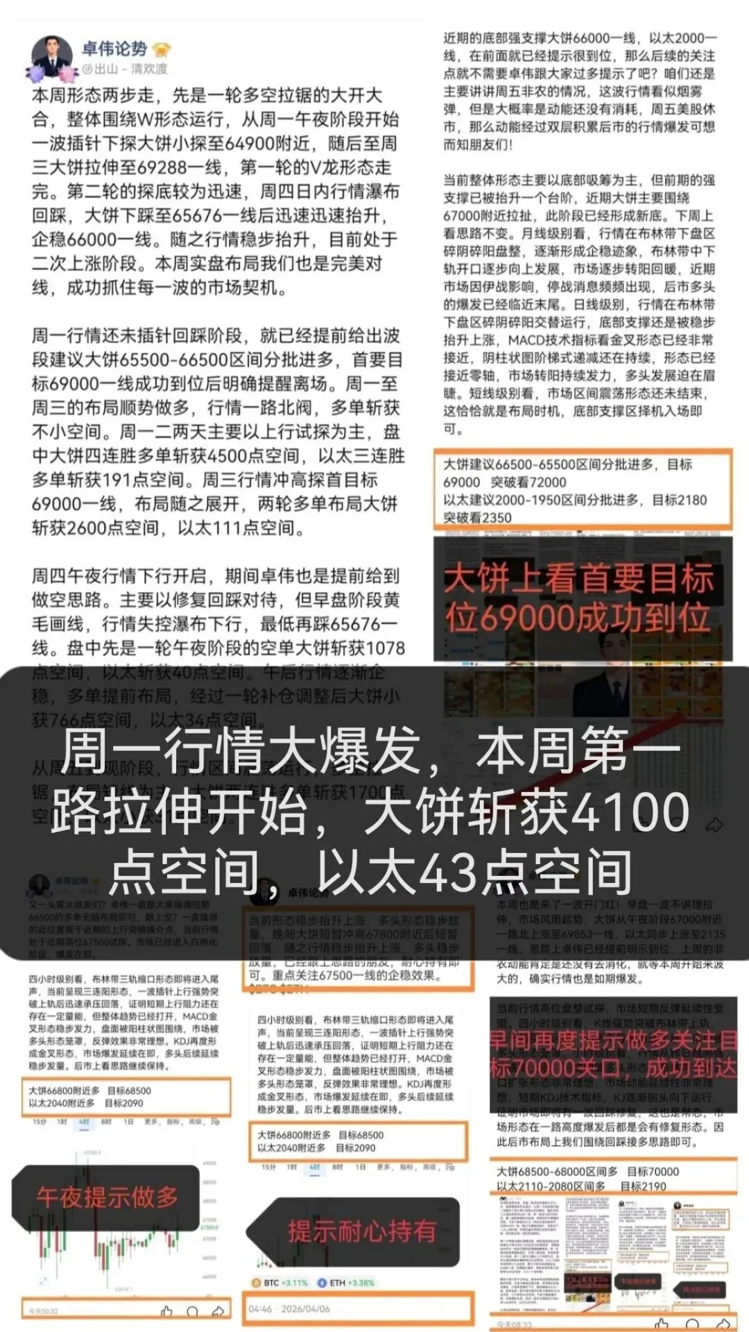 币圈交易的本质就是多空转换之间的牛熊博弈,只要把握住每一轮的风口,起飞就是水到渠成的事情。本周形态就走的非常明确,整体呈现浪型上涨形态,市场被多头情绪笼罩,从周一阶段开始大饼67000附近一路北伐上涨,最高拉伸至737700附近,以太同步跟随上涨至2330附近。卓伟本周思路一如既往高度在线,上周给到的本周上看目标纷纷到位。