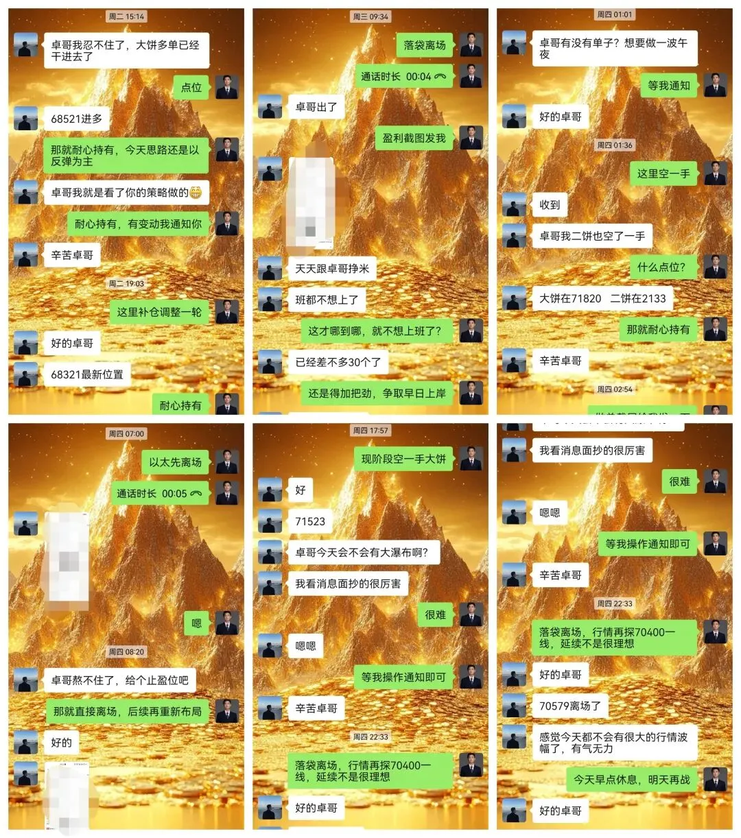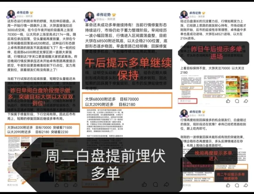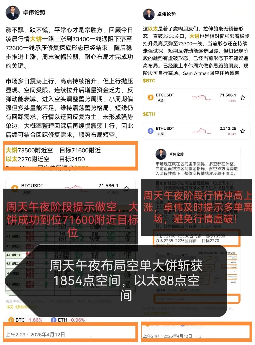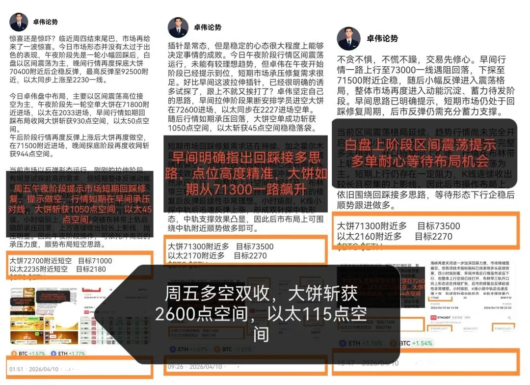 币圈交易的本质就是多空转换之间的牛熊博弈,只要把握住每一轮的风口,起飞就是水到渠成的事情。本周形态就走的非常明确,整体呈现浪型上涨形态,市场被多头情绪笼罩,从周一阶段开始大饼67000附近一路北伐上涨,最高拉伸至737700附近,以太同步跟随上涨至2330附近。卓伟本周思路一如既往高度在线,上周给到的本周上看目标纷纷到位。