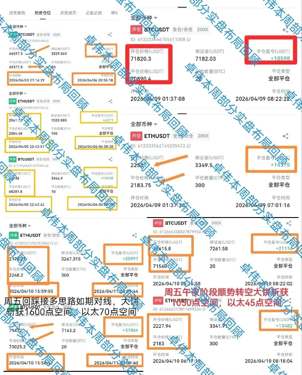 周二行情短暂修复回踩,主要试探70000关口突破效果,布局顺势抓回踩做空一轮,早间收网大饼斩获1628点空间,以太48点空间。