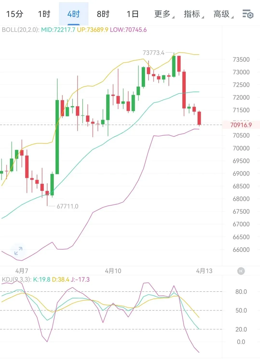 技术面上看日线级别,行情K线试探上轨后短暂承压回落,但整体下探动能未能形成延续,前期底部支撑70500的支撑还在持续放量。四小时级别看,行情即将触及下轨支撑区,结合前期支撑效果而言,底部支撑毋庸置疑,后市触底反弹形态非常理想,KDJ指标看,J线已经到底下行空间,下行已经无力回踩,短期的反弹势在必得,后市回踩接多思路继续保持延续。