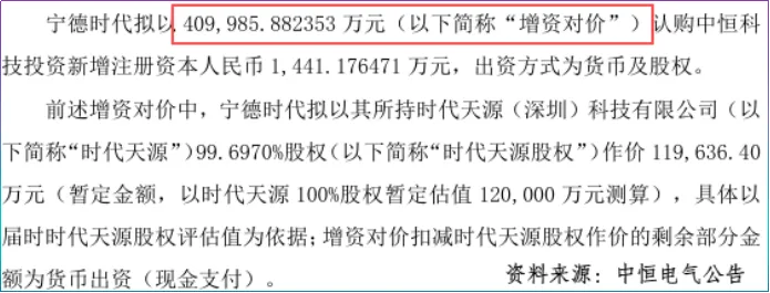 4月9日,中恒电气发布了一份股权拟变更公告,称宁德时代将以41亿元对公司控股股东中恒科技进行增资。