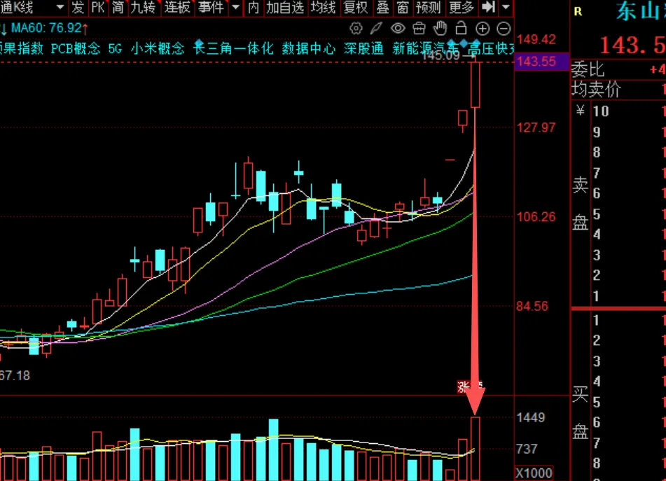 加速偏离五日线均线之后爆出近期最高成交量,小心成为短时间内的最高点!!