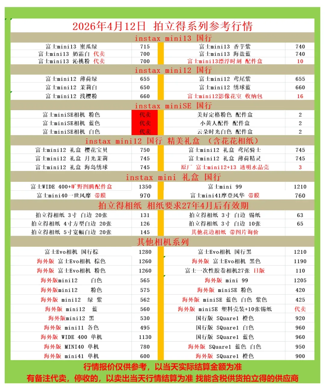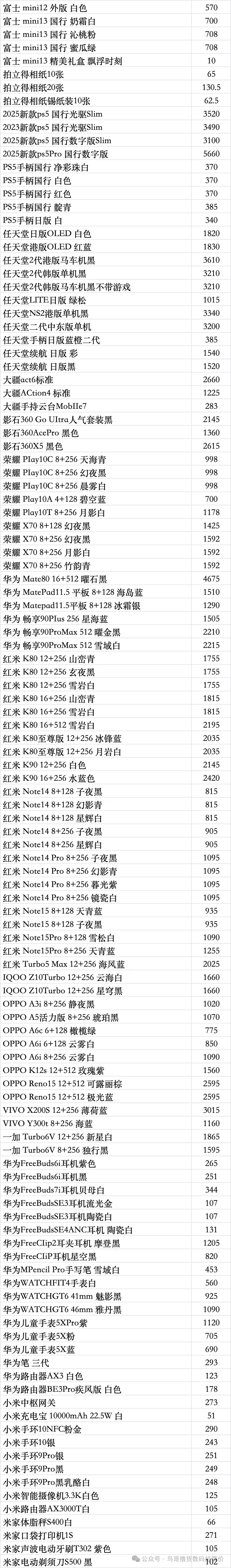 任天堂游戏机: 新款二代NS2港版标配机:3325 新款二代NS2港版马车机:3585,没游戏码:3320(注意下单要看有没有游戏码的 要不然就是便宜的) 新款二代NS2新加坡版 台版 单机:3240,就是没有游戏的 新款二代NS2韩版 欧版 美版 单机:3210,就是没有游戏的 新款二代NS2新加坡版同捆:3560,没游戏码:3210 NS2港版宝可梦同捆:3610 OLED屏 日版白-25年生产日期1800 彩色-1925 OLED屏 港版白-1755 彩色-1825 OLED屏 国行白-1645 彩色-1645 OLED屏 朱紫港版-1870 日版-1870 OLED屏 喷射港版-1870 日版-1870 健身环国行-125 海外版-325 LITE日版 港版 蓝:1005,黑粉1005,绿黄1005 任天堂日版闹钟:470 任天堂闲聊花:165 注意区分,这些就不是oled屏的 价格以下(续航版) NS续航国彩-1420 黑-1300,拆封-50 NS续航日彩-1520 黑-1460 长款-30 索尼PS5游戏机 (PS5都要留好纸箱带来,以免破坏品相) 2024新款:PS5 PRO日数:5710 2024新款:PS5 PRO港数:5910 2025新款:PS5 PRO国数:5610 2023新款ps5 日版光驱Slim:3610 2023新款ps5 日版数字Slim:3100 2023新款ps5 国行光驱Slim:老款:3490,2025新款3510 2023新款ps5 国行数字Slim:3010 2023新款ps5 港版光驱Slim:3660 2023新款ps5 港版数字Slim:3100 PS5国行手柄普通色:360,珠白靛青凫绿380,外版-40 PSP串流机:1395白,1395黑 PS5单国光驱:545,外版505 ROG XBOX :6730 OLED SteamDeck掌机掌上游戏机 512G 美:4580,日港:4580 OLED SteamDeck掌机掌上游戏机 1TB 美:5300,日港:5300 大疆3标准:,全能: 大疆Action4标准:,全能: 大疆ACT5 Pro标准:,全能: 大疆action5pro畅拍: 大疆AC6标准: 大疆AC6畅拍: 大疆NEO标配:,全能: 大疆OM7P:,om7: 大疆 mic1拖1:,1拖2: o4图传: 拍立得MINI12影像花室套装:,外版,一次成像礼盒装 拍立得SE国行:,白色: 拍立得相纸20张:130.5,10张:65 拍立得锡纸装10张:62.5 任天堂 手柄 NS左右手柄:345 NS2左右手柄:385 NS2 PRO 黑柄:395 PRO国黑柄:295,外版280只收跨境 PRO乱斗柄:330只收跨境 PRO王泪柄:330只收跨境 PRO喷射柄:330只收跨境 PRO异度柄:330只收跨境 华为手表目前行情参考 华为 Watch FiT4 黑550白560绿595紫555银595 华为 Watch FIT4 pro 黑1065蓝1045绿1145 华为WATCH FIT 3 黑395灰405月光白395原野绿405粉395薄荷绿395蓝395珍珠白420 华为WATCH FIT 2活力款 黑色315粉310 Watch D2 黑 2845白2845蓝2855 药房版 2515 Watch buds 黑1125卡其色 1225 Watch 5 46m 黑1780紫2145棕 2195蓝1880钛空银 2455 Watch 5 42m 黑1695白1825杏2235绿1670金2345 非凡2 黑4825蓝5845 非凡手表 黑3025 华为新款WATCH GT6系列 GT6 pro 黑1800棕2135钢2545 GT6 46m黑 1095灰色 1245绿色 1375 GT6 41m 黑 925棕色 1225白色 1240紫色1015蓝985青1010 华为新款WATCH GT5系列 GT5 46黑1005蓝935棕850灰860 GT5 41 黑 895蓝760白850青795棕735 GT5pro 黑1085陶瓷2075钛钢色 1350冰川白975 华为儿童手表系列 儿童4pro蓝485粉490 儿童5pro 蓝740粉740绿735紫755 儿童5X 蓝690粉705 儿童5Xpro 黑1040紫1115 儿童5 绿365紫365蓝415活力蓝355红335 儿童5星耀 粉430蓝430 荣耀,华为手环 荣耀手环9标准黑93蓝100紫100 荣耀手环9NFC 黑120蓝120紫120 荣耀手环10标准黑140绿138灰138蓝140 荣耀手环10NFC 黑155灰155绿155蓝150 华为手环系列 华为手环8标准黑103粉105 华为手环8NFC 黑110 华为手环9 黑135白125粉125 华为手环9nfc版 黑145白135粉135 华为手环10标准 黑159粉159 华为手环10铝合金款 黑159白160蓝160紫163向新绿155原野绿150灰150 华为手环10NFC 黑183白185蓝187紫187绿187 华为手环11 标准版 羽砂黑 203流光紫 200 华为手环11 铝合金版 羽砂黑 215星云杏220流光紫220悦动白220草木绿 220 华为手环11 NFC版 羽砂黑 240星云杏 245流光紫 245悦动白 245草木绿245 华为手环11pro NFC版 羽砂黑 290海岛蓝290原野绿290 B7 黑650灰665 华为耳机系列 华为Free Arc 绿405灰415黑415白405 华为 FreeBuds 7i 白338灰332粉340 华为freebuds6i耳机 白255黑250紫260 华为耳机Free clip2 黑1195白1185蓝1185金1200紫1205 华为耳机Free clip 黑色815暖星云845紫 775玫瑰金780 华为耳机FreeBuds 5i 黑208白218蓝218 华为FreeBuds se2 耳机 白72蓝73黑73紫73 华为 FreeBuds se3 黑100金100白100 华为 FreeBuds Se4 白128黑127 FreeBuds 6 白485黑490紫490金485 FreeBuds 4e 2024款 白295银295 FreeBuds pro5 白1050银1075金1060蓝1075 FreeBuds pro4 黑665绿680白680 华为CD56 pro笔 450 华为CD57 黑245白255 华为CD54S 三代笔292 华为 三代笔充电器 85 Wifi5 黑175白175青175 WiFi3 pro 270 AX3 120 AX6 new 237 AX3 pro new 185 AX3 pro WiFi7 187 BE3pro 千兆版 180 BE3pro 疾风版 170 BE7pro 388 BE7 335 AX2pro 100 荣耀手表 荣耀手表x5 白250黑250 荣耀手表x5i 白143黑143 荣耀手表5pro 蓝牙版黑1095灰1085 荣耀手表5pro 插卡版黑1185灰1185 荣耀手表5Ultra黑1215棕1475钛金属1895 荣耀手表5 黑565金565 移动电源 华为22.5w se 移动电源 黑85白88 华为66w 电源 白178蓝180 |