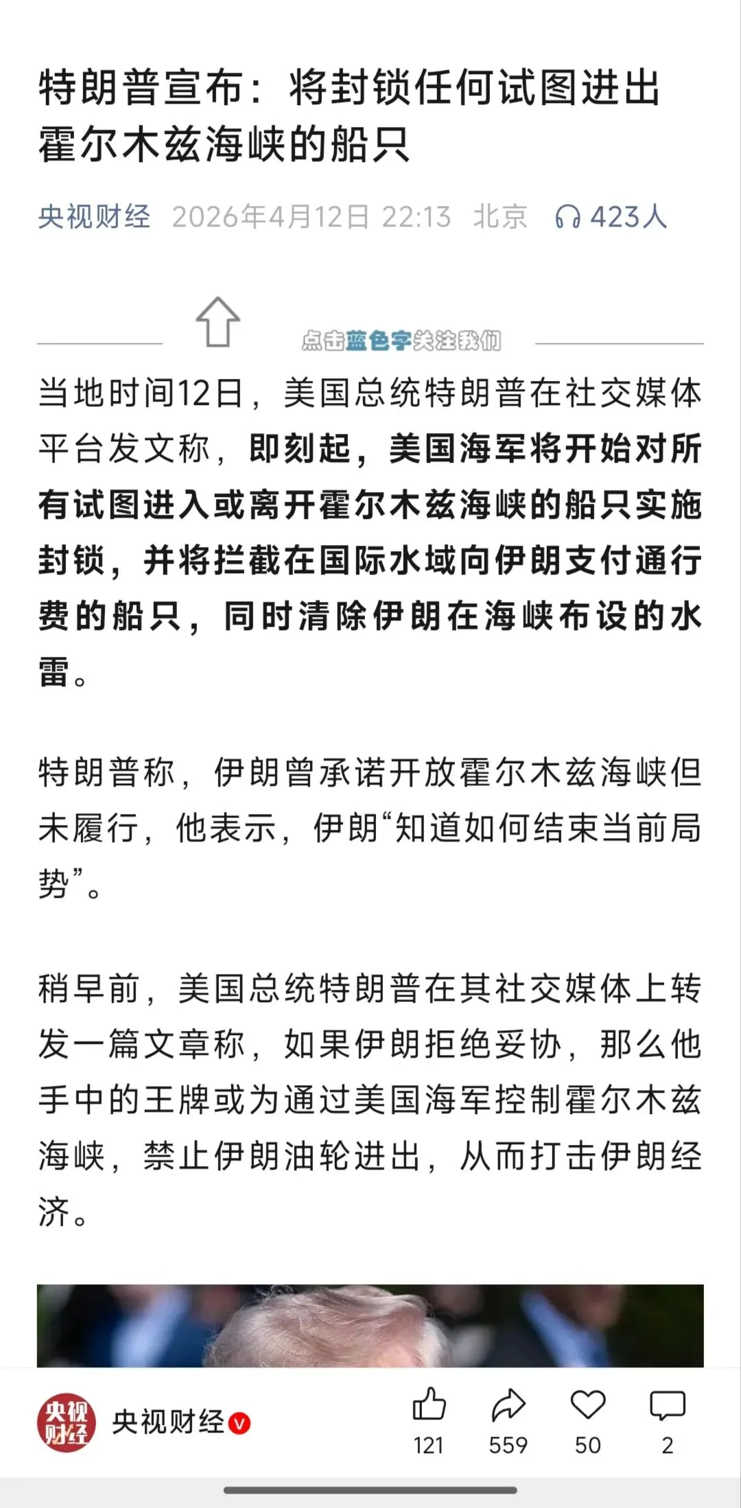然后,霍尔木兹海峡,伊朗目前还是放极少量的船只出去,不管有没有收费;可是,美国刚刚扬言,所有船只都别想着进出霍尔木兹海峡了,你付钱给伊朗,我还要查你。