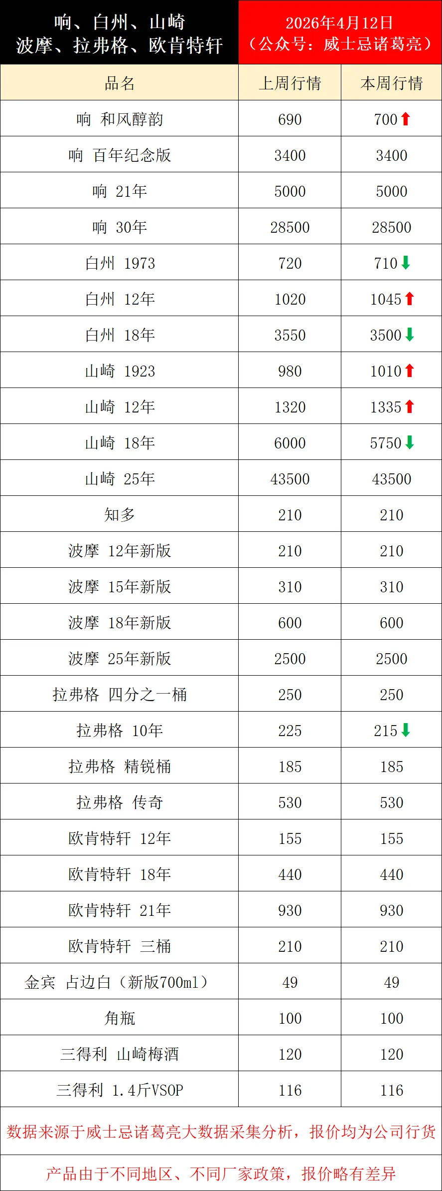 厂家端、一批:三得利由于供货价全面上调,配额收紧、一批拿货难、到货周期拉长。二批端:由于各地促销方案不同、抛货下跌、倒挂明显,二批核算总体利润,动销慢产品例如苏威成为抛货产品;高端款(25/30 年、限定)价差极大、行货 / 水货 / 收藏价分层严重、成交分化,厂家控量保价、渠道去库存、活动冲量、供需错位导致 “出厂涨、终端跌” 的矛盾行情。帝亚吉欧行情分析:苏格登(12/15/18 年、蓝牌等常规系列):常规流通主力,厂家直补 / 满减 / 搭赠 / 组合套餐,终端价较上月下跌。厂家主动让利冲量、去渠道库存、抢市场份额,短期压制终端价;但厂家供货价未降、配额稳定,形成 “厂家促、终端跌、渠道利润被压缩” 的短期行情