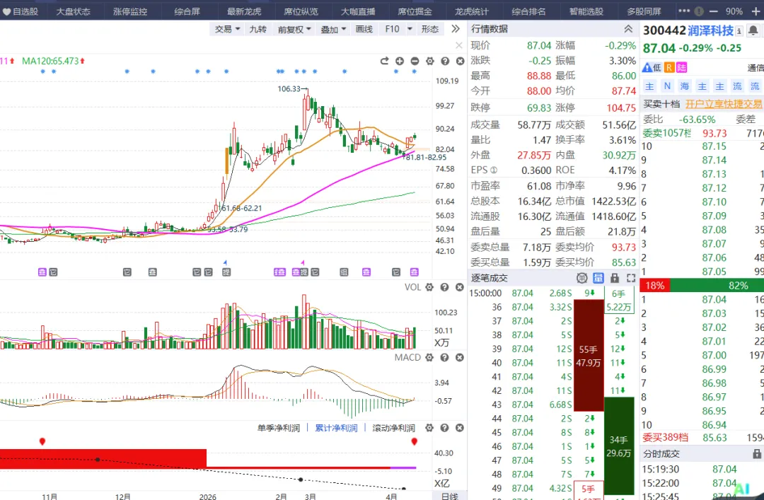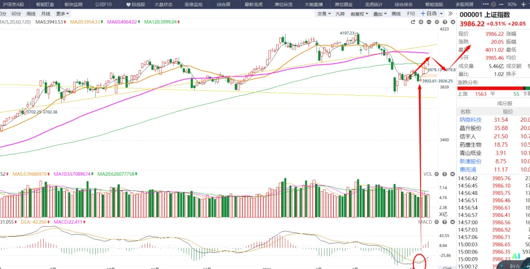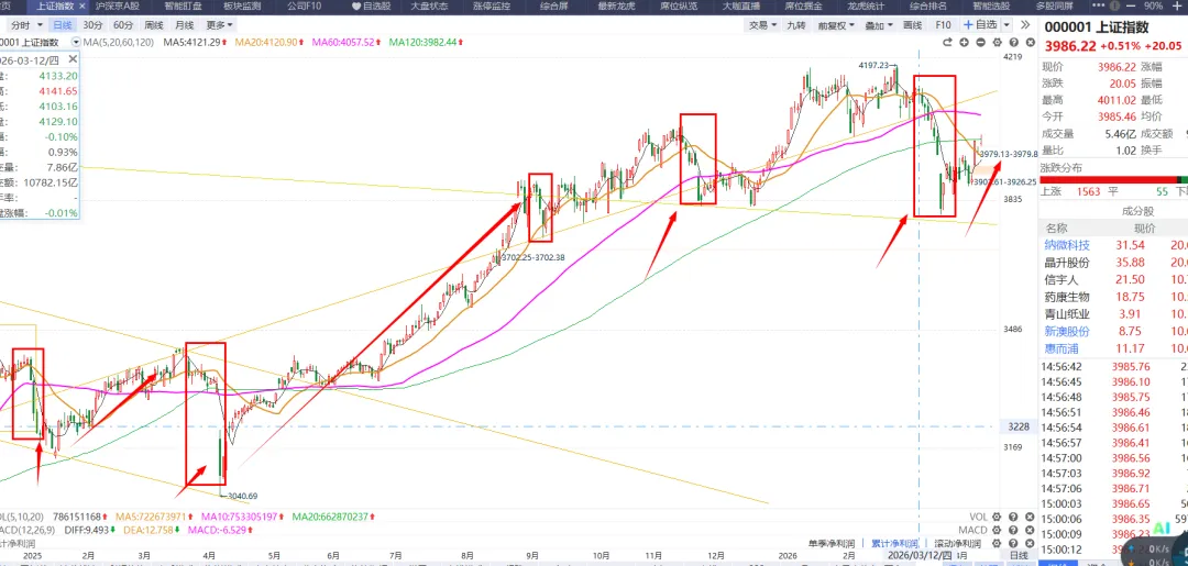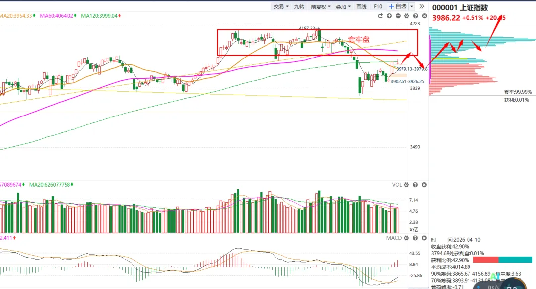 首先是对于谈判的问题,谈崩了,周一会不会是黑色星期一?之前我就聊过,就像俄乌战争刚开始一样,现在已经4年了,市场都已经走出新高了,所以战争对于市场的影响只是短期的。大家可以看当年的海湾战争,那时候市场怎么样呢?推荐一下书籍和电视剧 ,书籍《货币战争》电视剧《大时代之世纪之战》首先是双方的条件,都太苛刻了,都不会答应的,所以谈判最后就是语言的艺术,三方都是赢的局面,目前这才第一轮啊。3、资金已经在本周三表明了立场, 市场不会再有较大的回落 ,接下来市场该走自己自身的逻辑的,不应该去看事件的影响,所以下周的市场没有必要太过担心的。本周二市场缩量到1.6万亿的水平, 周三市场放量8千亿到了2.4万亿的水平,资金呈现推土机的方式发动了普反以及局部较强的反弹。这8千亿的资金不是散户的,是机构进场的信号啊。所以机构已经对于这个事件消化完了, 重新再度进场,已经表明了态度了。再就是周五盘后的创业板改革的事情,创业板代表的是科技企业,对标的是美股的纳斯达克的,所以创业板未来会涌现很多优质的企业好公司的越来越好,不好公司的越来越不好,这也是国家想要的市场,也是一个健全的市场应该有的模样。至少市场目前是大级别的反弹,能不能走出反转来不好说。1、技术形态上,上周的复盘我们说过,指数反弹要上20日均线的, 然后对于20日线的回踩确认之前 ,都是反转的左侧买点 ,右侧买点是对于指数的20日线回踩确立的时候 。如果回踩不跌破再度向上,行情才可以确立反转的。2、不具备反转,而是反弹的因素在于市场没有持续的方向出来。主线的大方向没有确认。这个是要牢记的方法, 资金还是在低位的超跌方向轮动反弹 尝试。最近的反弹从医药的创新药、能源的储能、大金融的券商等等这些都是市场的超跌反弹的方向,资金在尝试做修复反弹, 之后在看谁能走出来了 ,行情的弱势,资金就会抱团,抱团在机构的CPO等业绩确定的方向,比如中际旭创走出新高,但是一旦主线切换,这些就要被吸血的。除非CPO继续牛 。综上所述 、指数反弹的预期就是4050附近,因为上面有比较大的套牢盘,指数这里需要有个回踩,之后慢慢震荡消化套牢盘,但是未来指数还是会有慢牛继续新高的,时间上怎么也得五一之后, 市场渡过了业绩披露期 以及慢慢淡化了对于中东的事件影响了。所以 技术上和事件的推理上,指数都是急不得的, 一个消化套牢盘需要时间, 再一个事件的淡化也是需要时间,多些耐心吧。所以下周市场冲高之后, 提防会有短线回踩的需求 ,并且下周过完,市场也快到了业绩的密集披露区了 ,一季报和年报的,毕竟越往后披露的业绩越不好 ,然后五一长假的资金担忧,所以下周过完,市场的成交量 也会受节前的影响。整个春节后回来, 出了第一周以外,再没有见到比较好的赚钱时间, 本周是一个不错的表现了 所以最近也是回了一大口血, 但是还是不够的,手中的个股的见底迹象是明显了但是这里板块还是要轮动的, 好的板块就会提前表现的, 不好的板块得到行情的末端 才会跟随指数慢慢的补涨 。1、由于接下来的业绩披露以及五一假期 ,所以指数以及市场也是回踩确认的需求 下周市场冲高要考虑降低自己手中做反弹的仓位,继续等待回踩确认之后这部分仓位再回来。市场还是继续看多的,但是这个回踩的情况以及力度不知道,也是为了给自己腾出子弹 。更好的做切换 。所以这个方向之前一直埋伏的是能够提前兑现的, 看下周市场的表现吧, 毕竟现在市场的量化反应太快了,周五直接都拉起来了, 周一的承接也是个问题, 只能慢慢走慢慢看 ,2)主线还是比较快的,如果AI 和稳定币不能走出持续 ,那么就要考虑手中的仓位做止盈, 切换到主线的方向去, 其他的方向只能是跟随这轮行情最后补涨再出来, 比如 脑机、等等。主流方向还是好做,能源的储能固态 ,超跌反弹 ,跌下来反弹就是新高,
