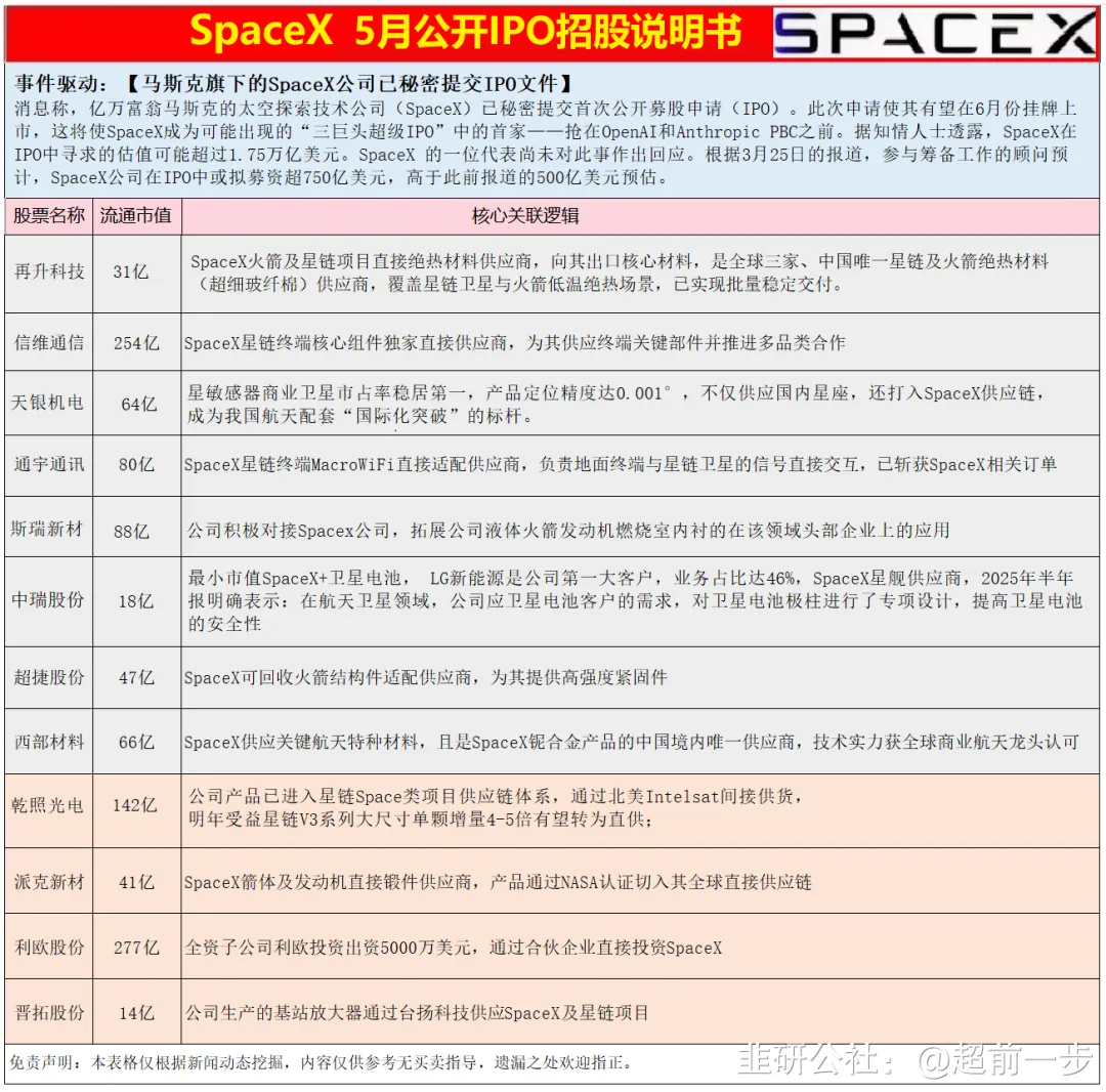 ①商业航天-中美商业航天竞赛:为充分发挥新型举国体制优势我国将对现有载人登月和无人探月领域资源力量进行深度统合;SpaceX计划于5月公开其IPO招股说明书,6月路演(再升科技、航发动力、信维通信、神剑股份、陕西华达等)