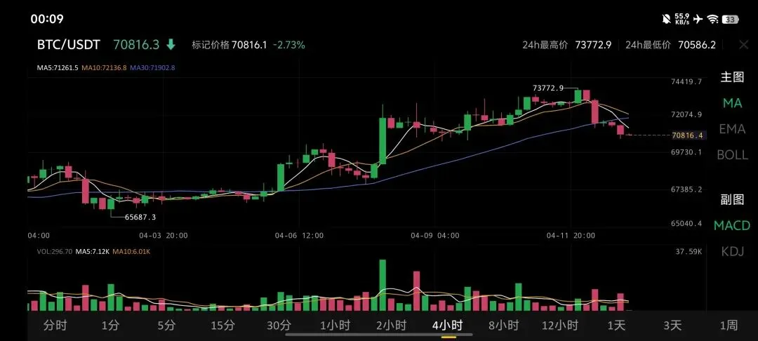 · 价格与趋势:现价约70816美元,24小时跌幅2.73%,已跌破MA5(71261)、MA10(72136)和MA30(71902),均线呈空头排列,短期趋势偏空。